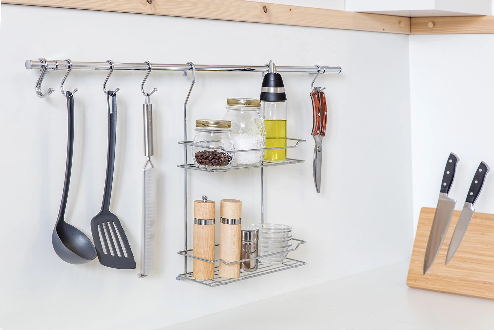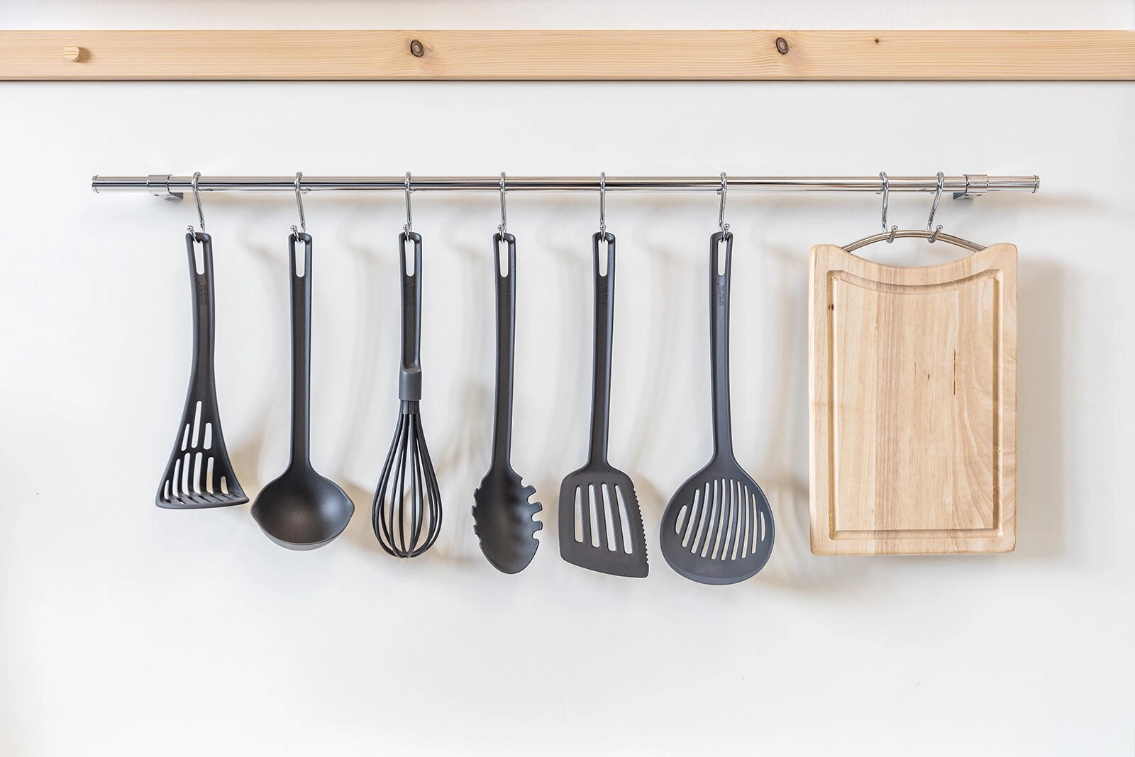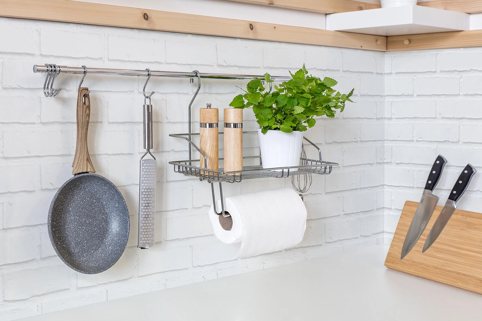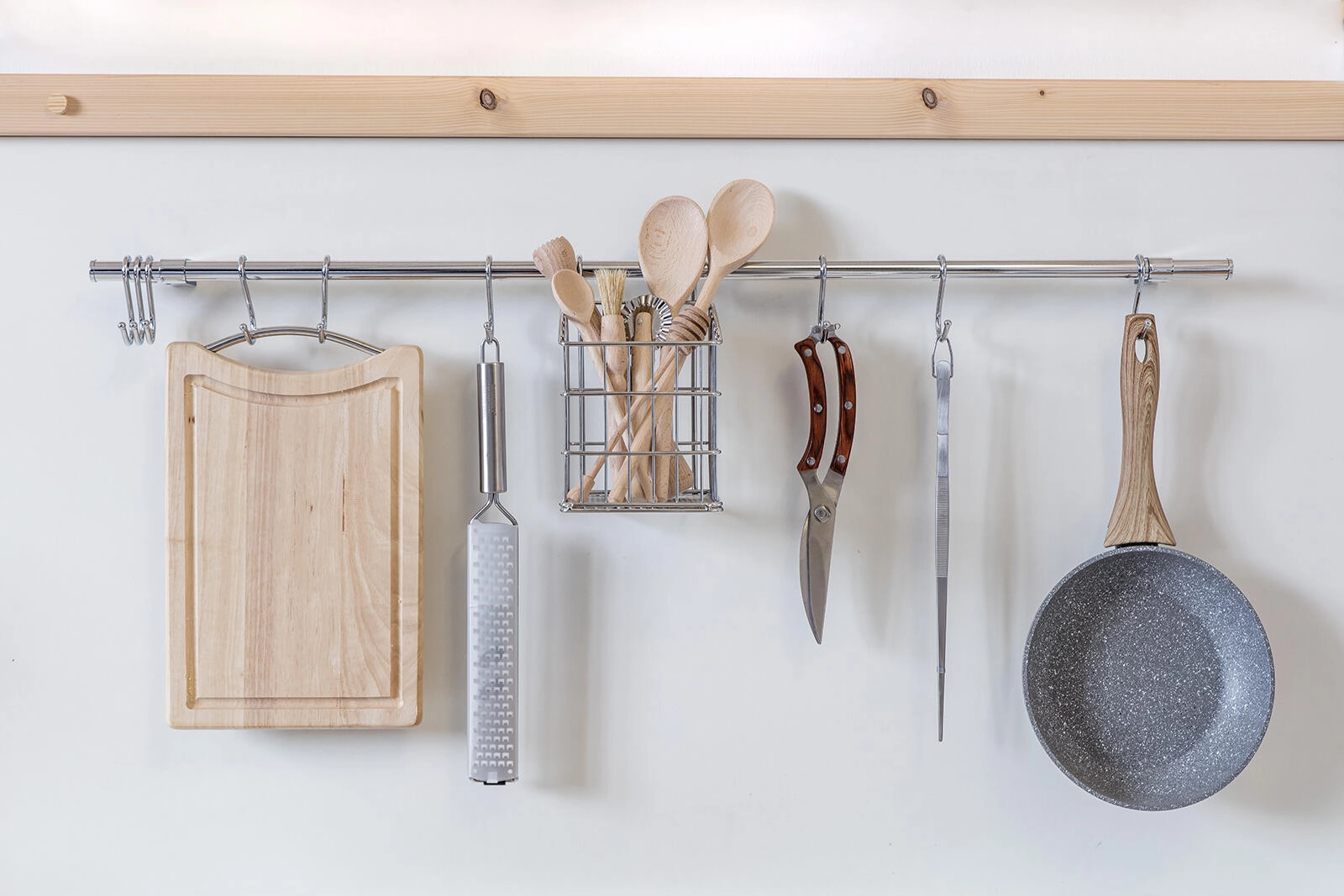 Suspendez les ustensiles les plus utilisés, planches à découper ou poêles sur des crochets pour les garder bien organisés et toujours accessibles.