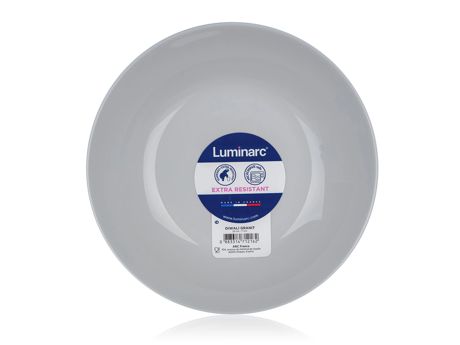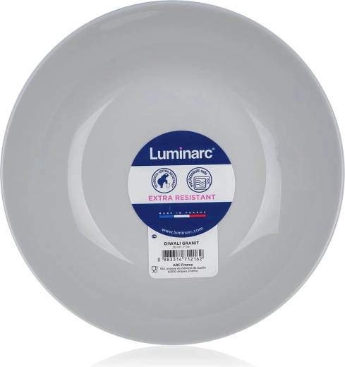 Élégante assiette creuse DIWALI de 20 cm de diamètre en verre trempé dans une couleur grise moderne, idéale pour servir soupes, pâtes et salades. Elle offre une haute résistance aux rayures et aux chocs thermiques, est non poreuse et facile à entretenir. Compatible lave-vaisselle et micro-ondes, et 100 % recyclable.