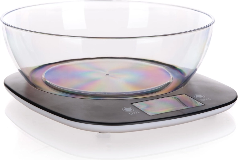 Balance de cuisine numérique pratique avec bol pour peser avec précision jusqu’à 5 kg avec une résolution de 1 g. Elle offre le changement d’unités pour aliments secs (g) et liquides (ml), arrêt automatique et indicateur de batterie faible et de surcharge. Le design noir élégant et le plastique résistant garantissent un entretien facile et une longue durée de vie.