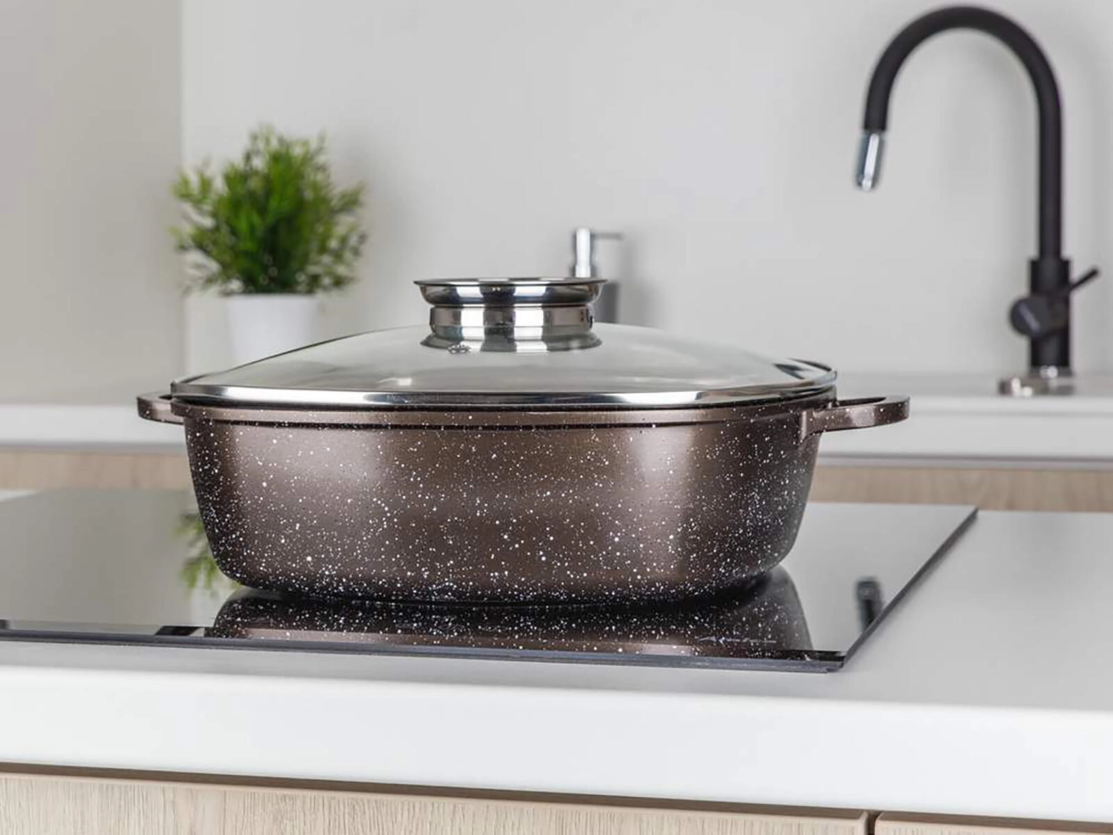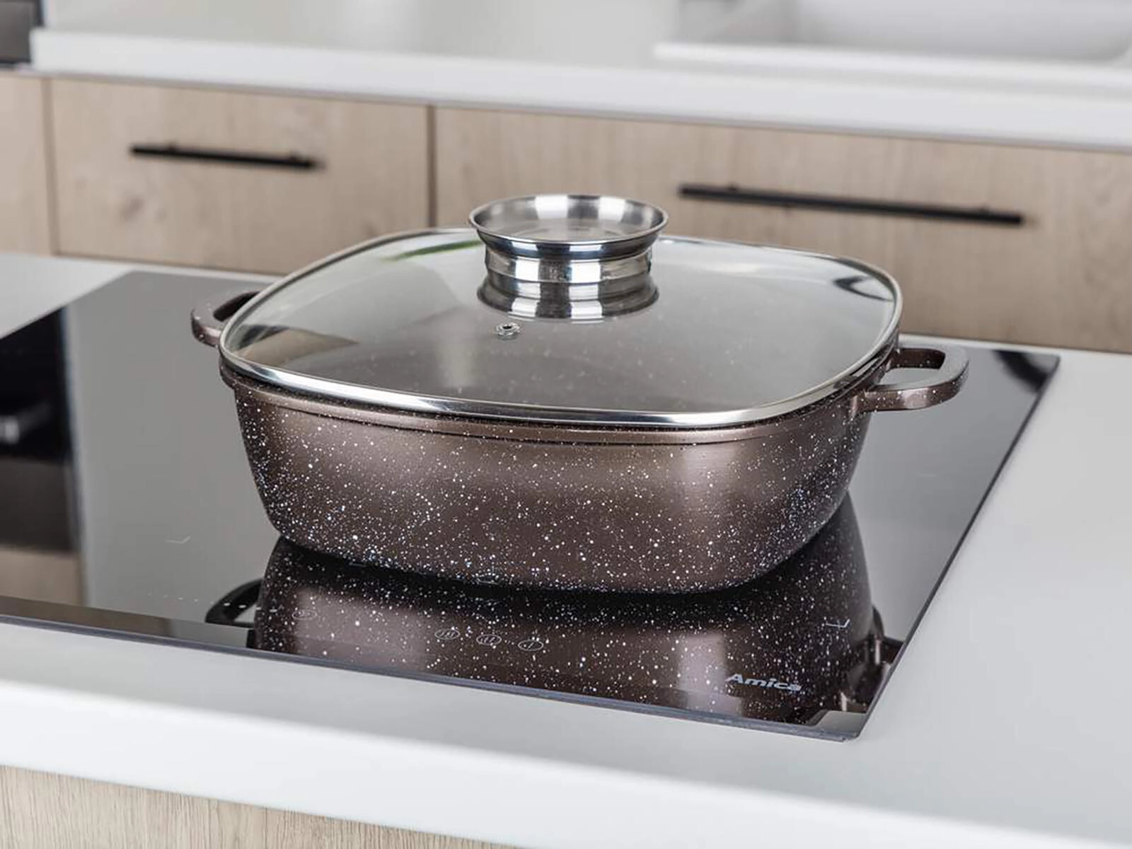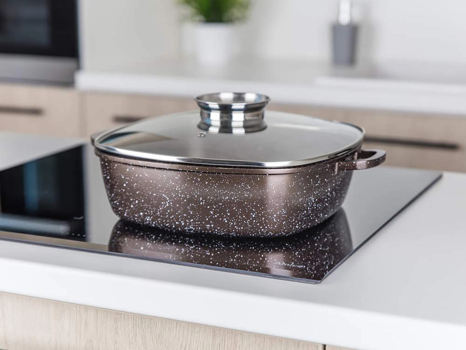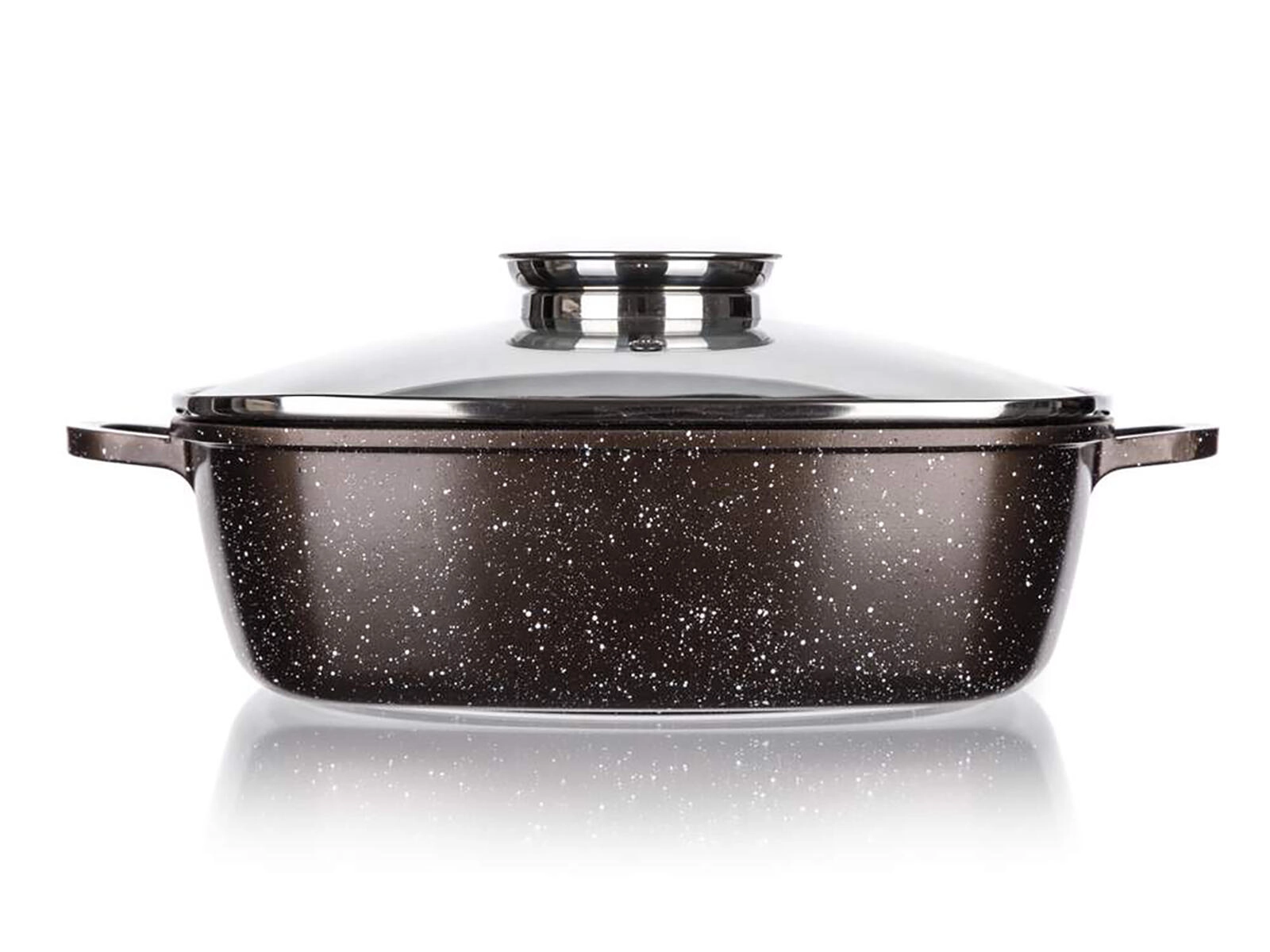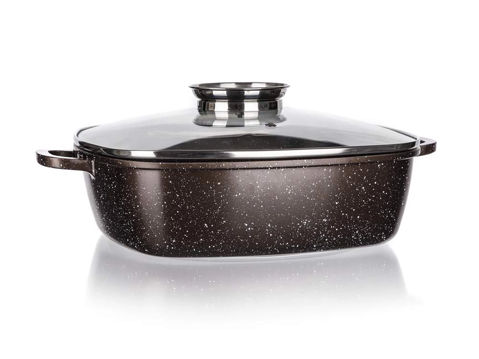 Plat à rôtir carré en aluminium coulé avec couvercle en verre et bouton aromatique pour une cuisson et un mijotage faciles. Grâce à son revêtement antiadhésif à 2 couches à structure marbrée, sa répartition uniforme de la chaleur et sa compatibilité avec tous les types de plaques, y compris l’induction, il est idéal pour la cuisine au quotidien. Revêtement extérieur résistant à la chaleur, parois robustes et fond épais garantissent durabilité et longue durée de vie.