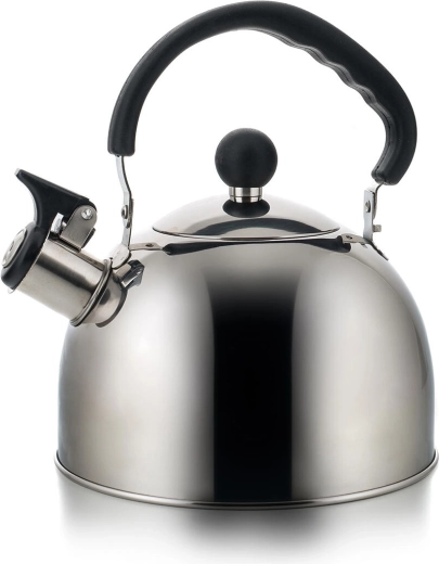 La bouilloire est conçue pour une utilisation polyvalente sur tous les types de plaques – électrique, gaz, vitrocéramique et induction. La poignée ergonomique en plastique assure une prise en main confortable et sûre. Grâce à ses dimensions compactes (hauteur 21 cm, diamètre inférieur 18 cm), elle convient aux petites comme aux grandes cuisines.