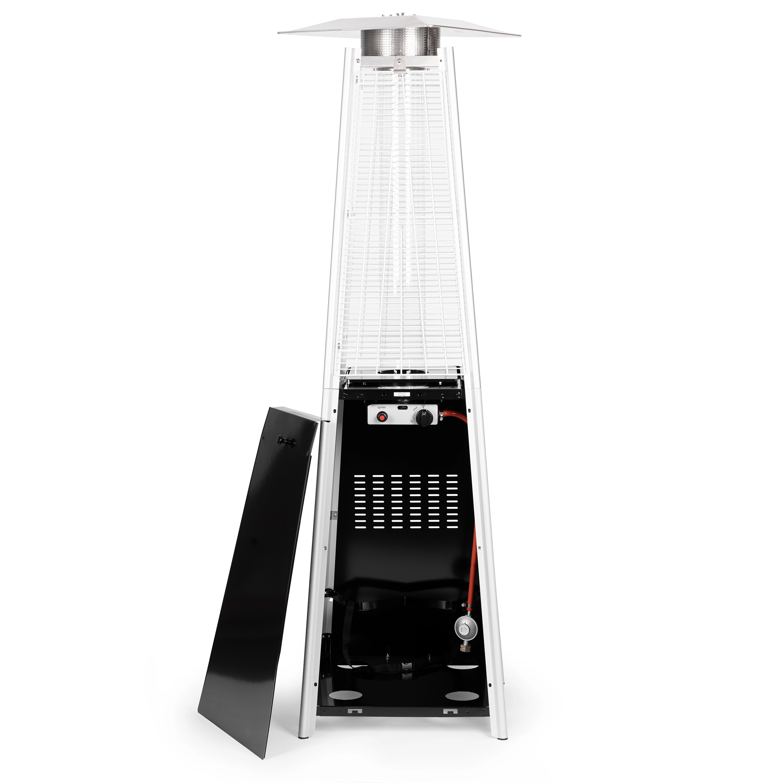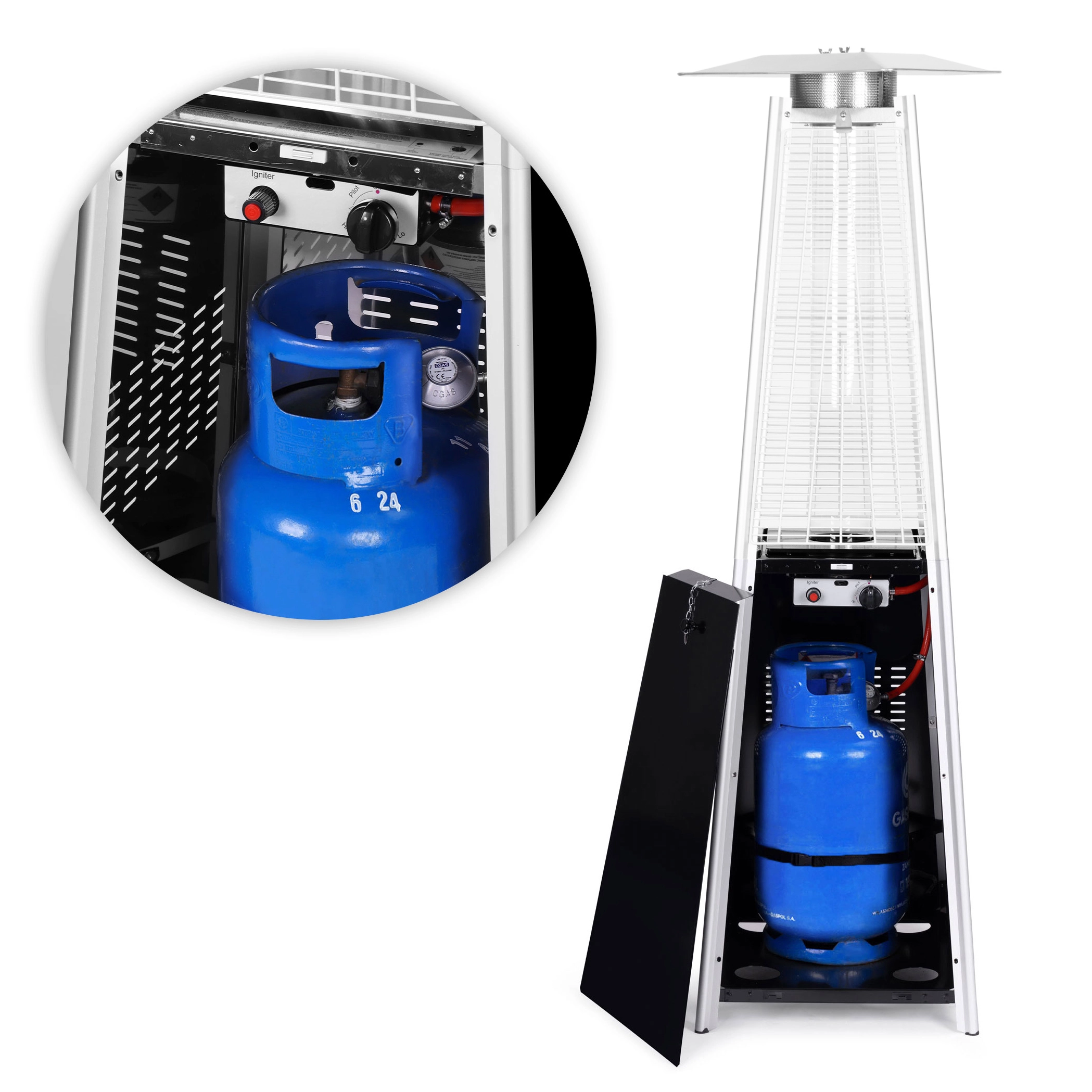 Pour une sécurité maximale, le chauffage dispose d’un espace verrouillable pour la bouteille de gaz (jusqu’à 11 kg) avec sangle de sécurité. Le colis comprend un détendeur de pression avec tuyau et une housse imperméable pour la protection contre la pluie et la poussière. La solution idéale pour des espaces extérieurs toute l’année.