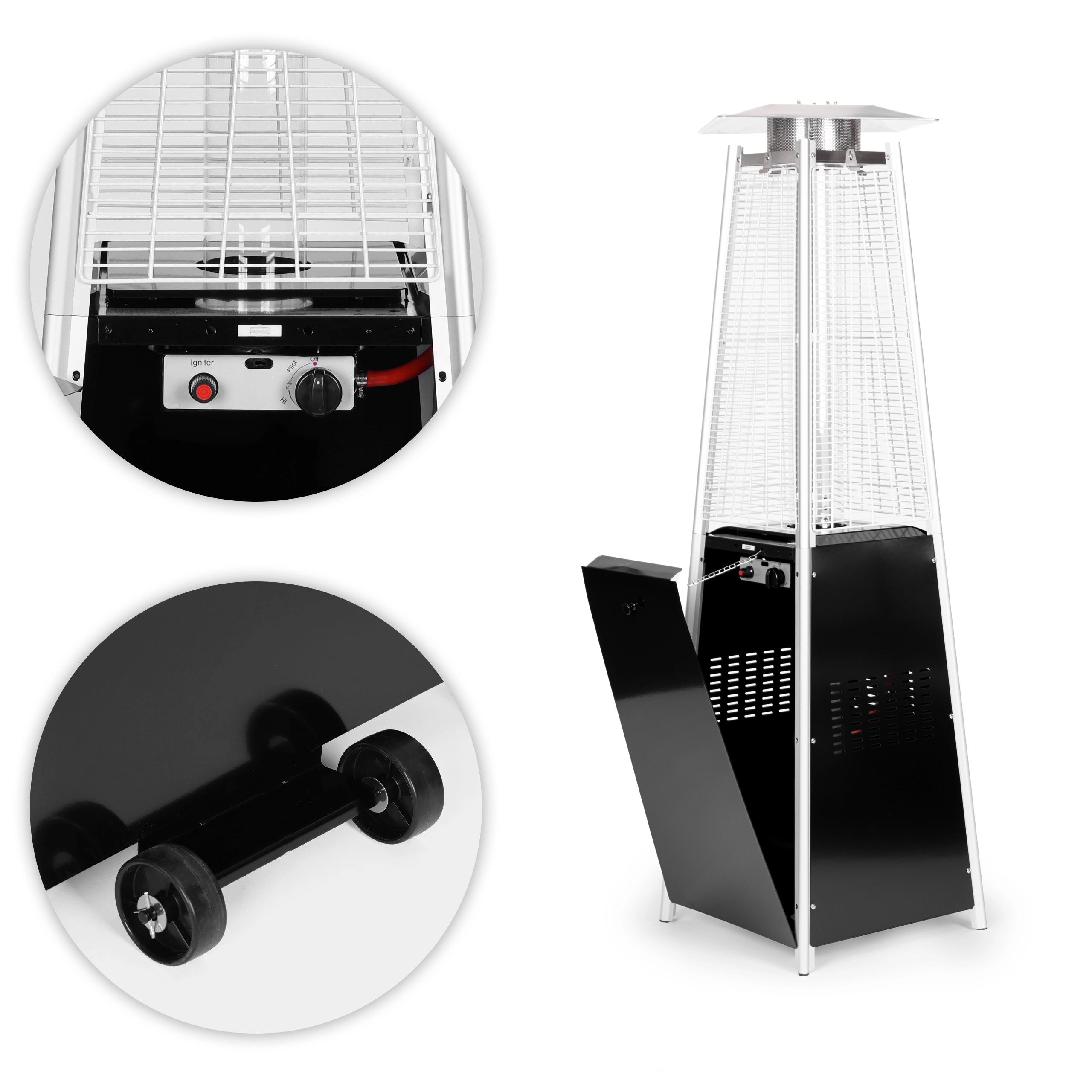 Le panneau de commande permet un réglage progressif de la puissance selon la météo. L’allumage électrique (1× AAA, non fourni) facilite le démarrage et le fonctionnement économe en énergie économise le gaz. Des roulettes intégrées et des embouts de pieds en caoutchouc simplifient la manipulation et protègent le sol.