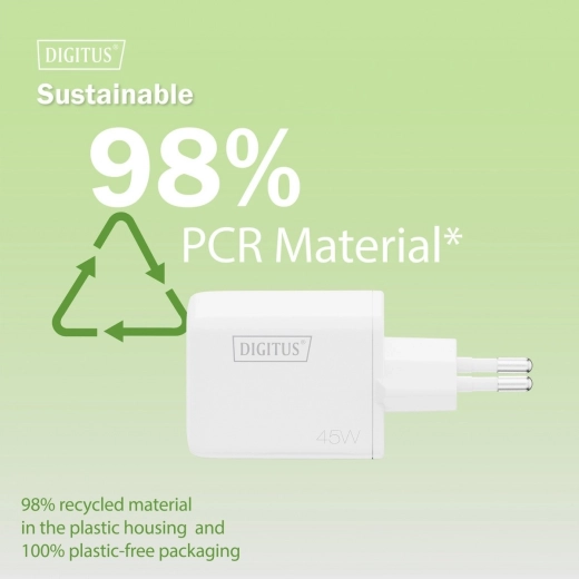 Le port USB‑C fournit jusqu’à 45 W, le port USB‑A jusqu’à 22,5 W. En utilisation simultanée des deux ports, le chargeur répartit intelligemment la puissance à 25 W (USB‑C) et 18 W (USB‑A) pour un fonctionnement sûr et stable. Une conception en plastique recyclé PCR à 98 % et un emballage 100 % sans plastique offrent un choix plus écologique sans compromis sur la qualité.