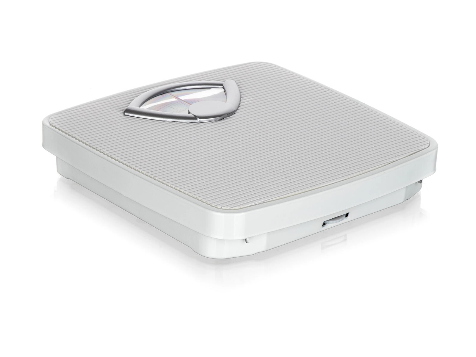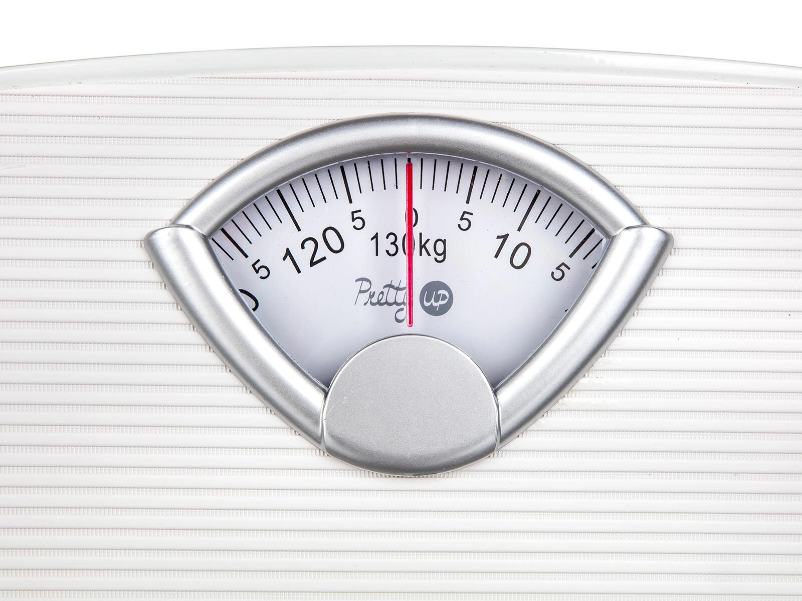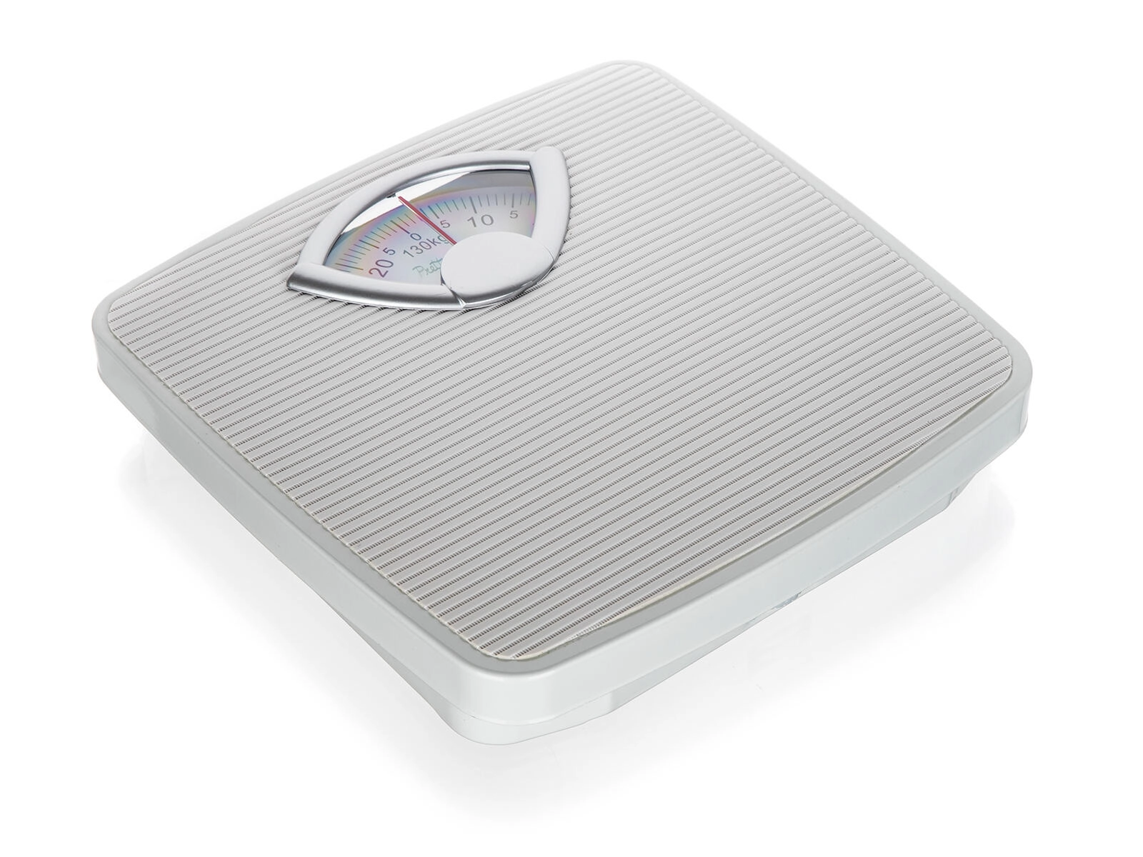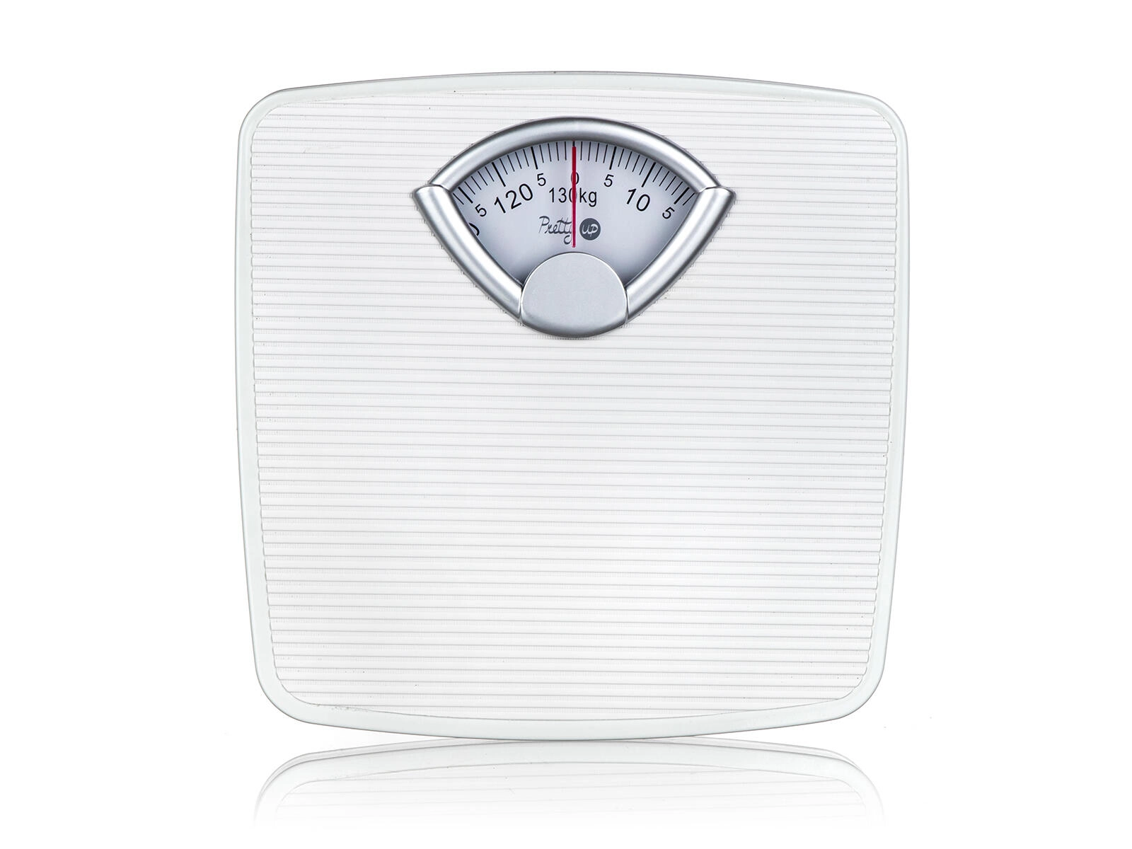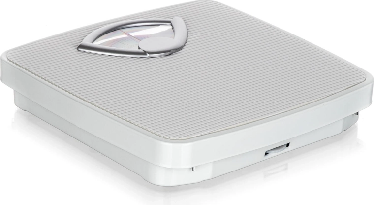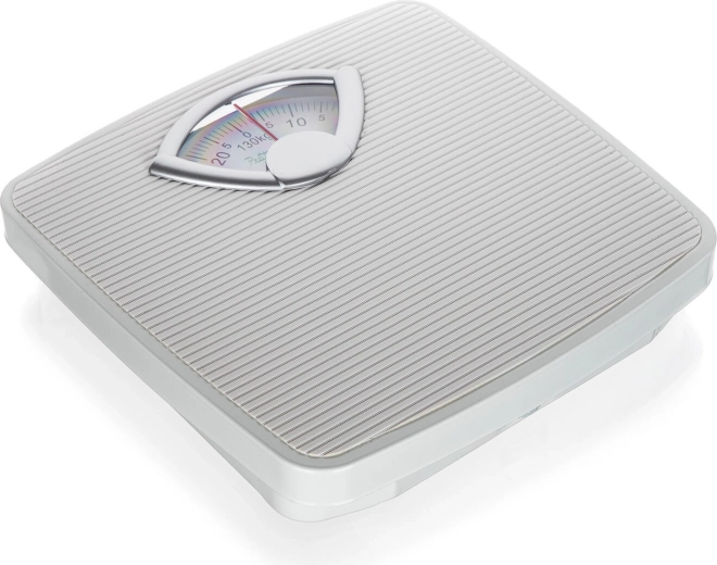 Pèse-personne mécanique compact avec une capacité de charge de 130 kg, offrant une mesure fiable sans piles, un cadran analogique bien lisible et une surface antidérapante pour une utilisation sûre dans la salle de bain.