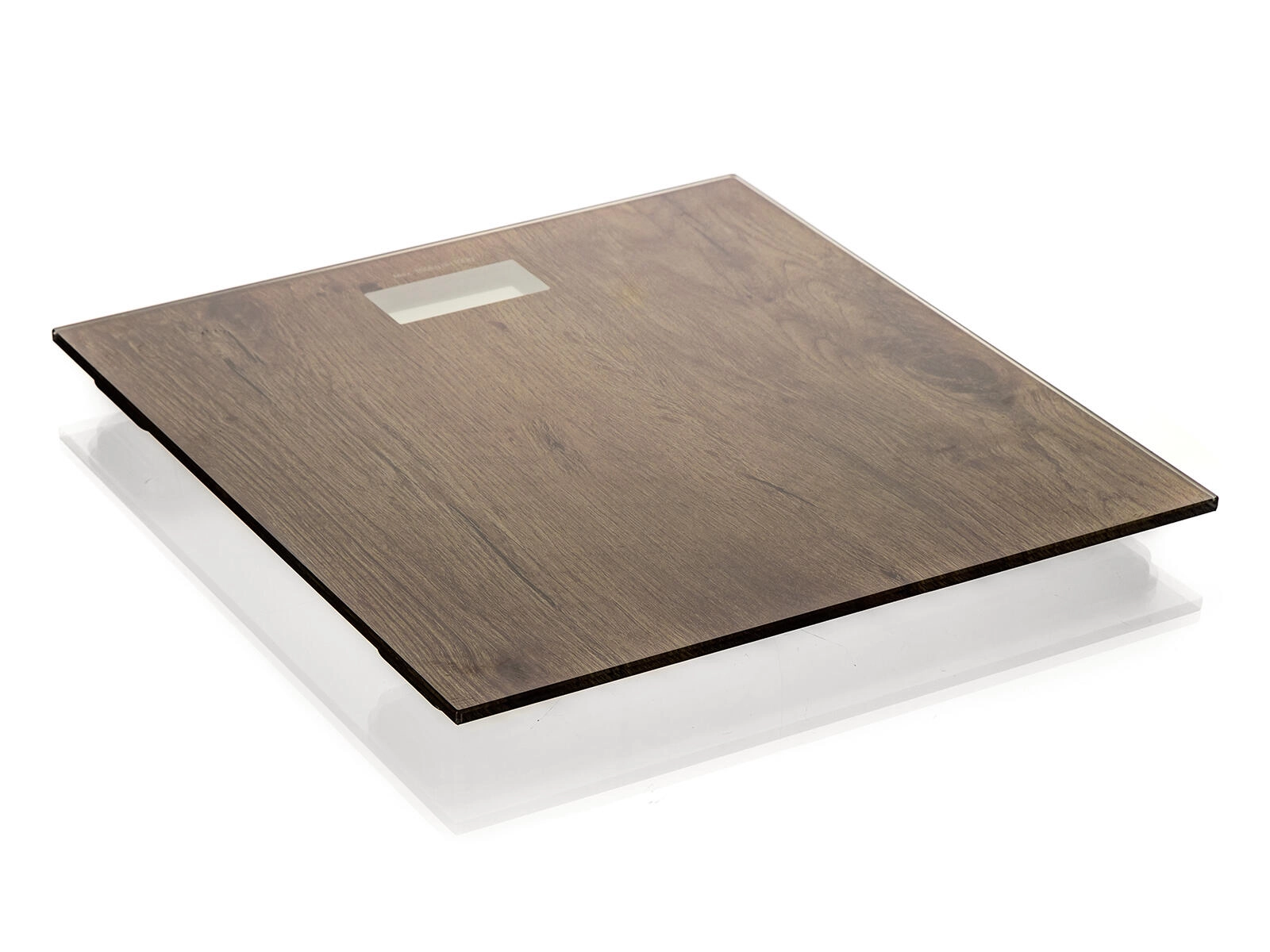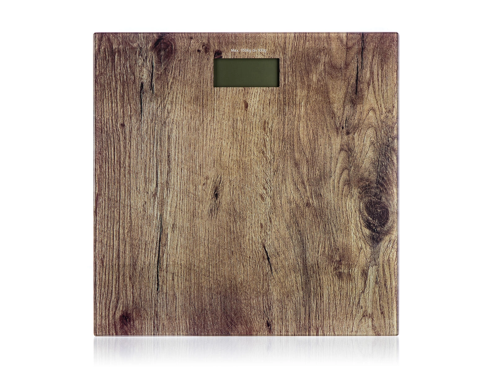 Balance personnelle numérique élégante à décor bois avec une capacité de 150 kg, offrant une mesure précise en kg et lb, arrêt automatique et indicateur de batterie faible et de surcharge. Son design raffiné s’intègre à toute salle de bain.