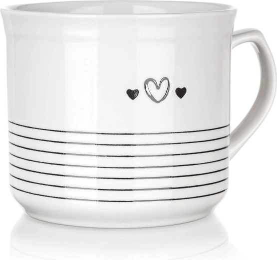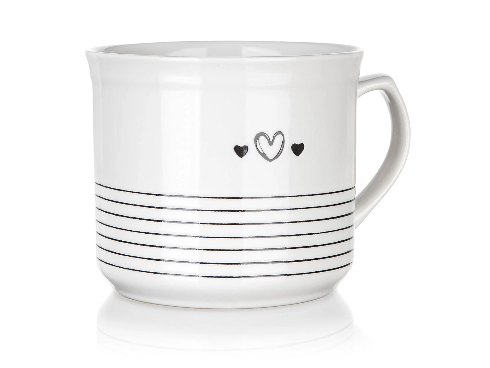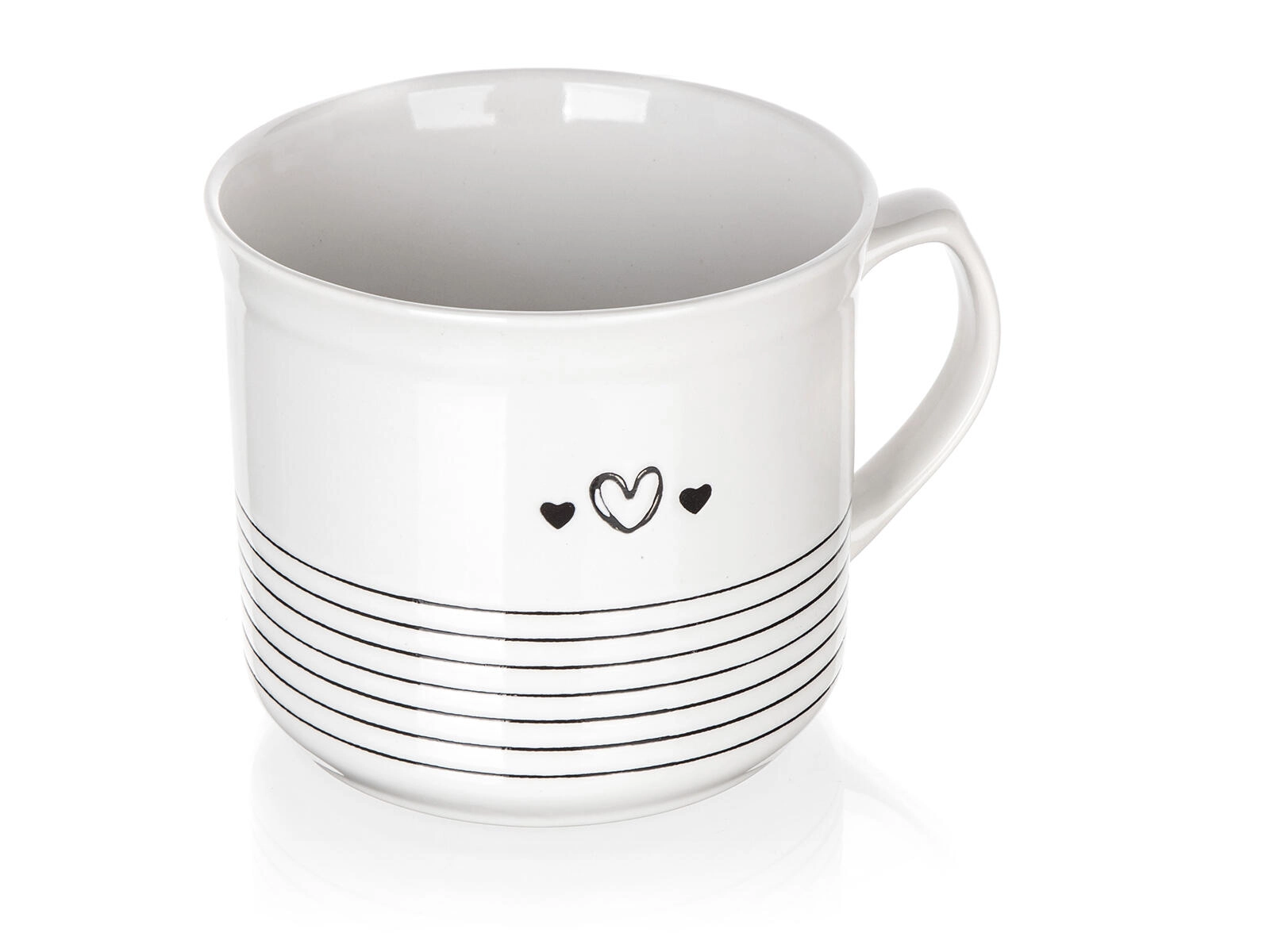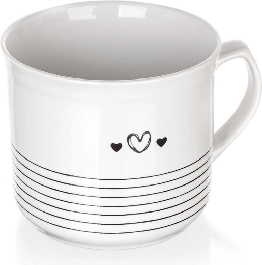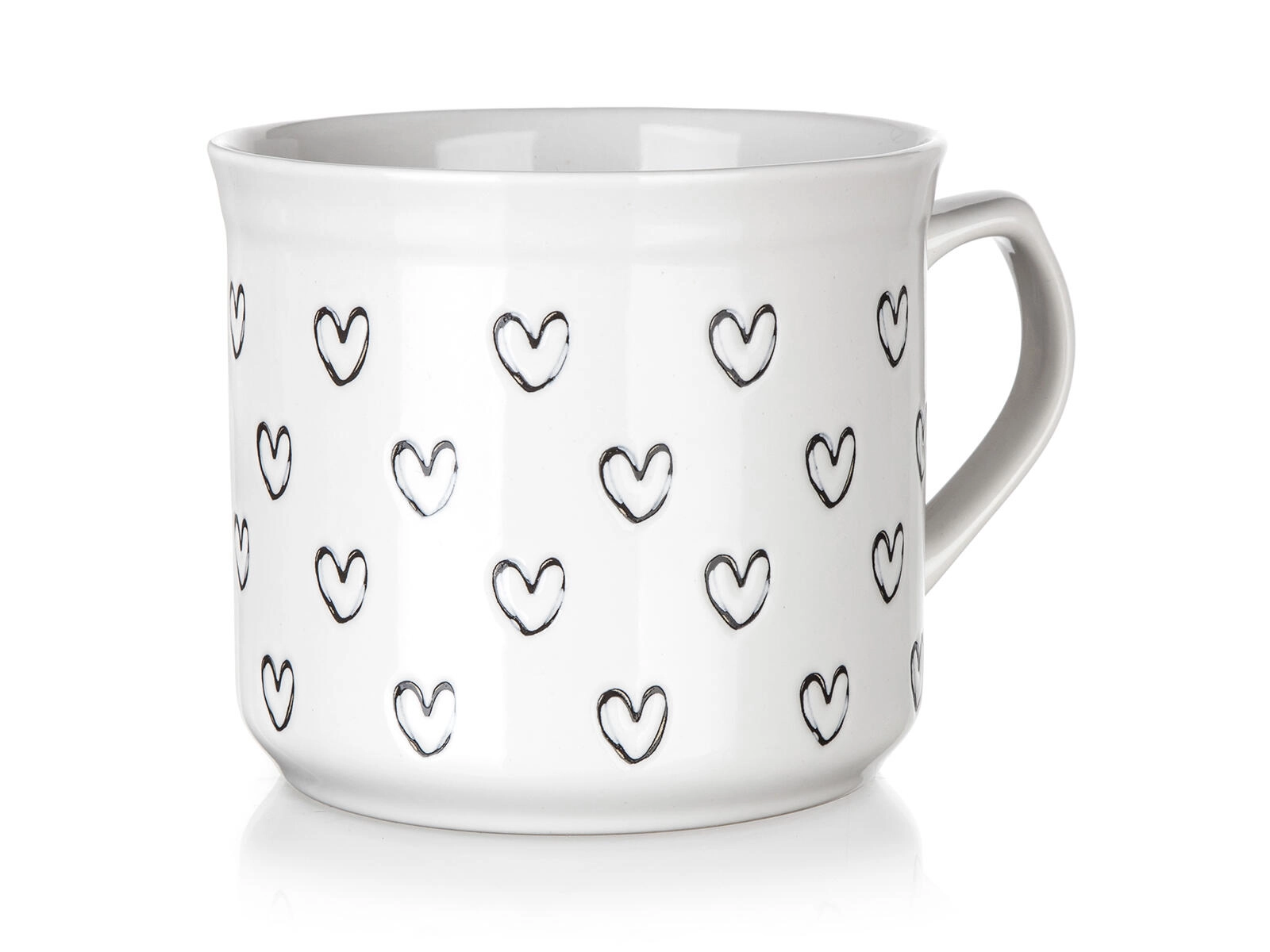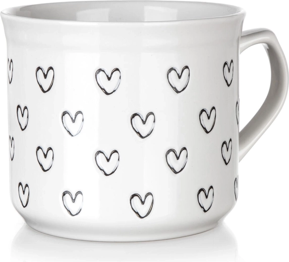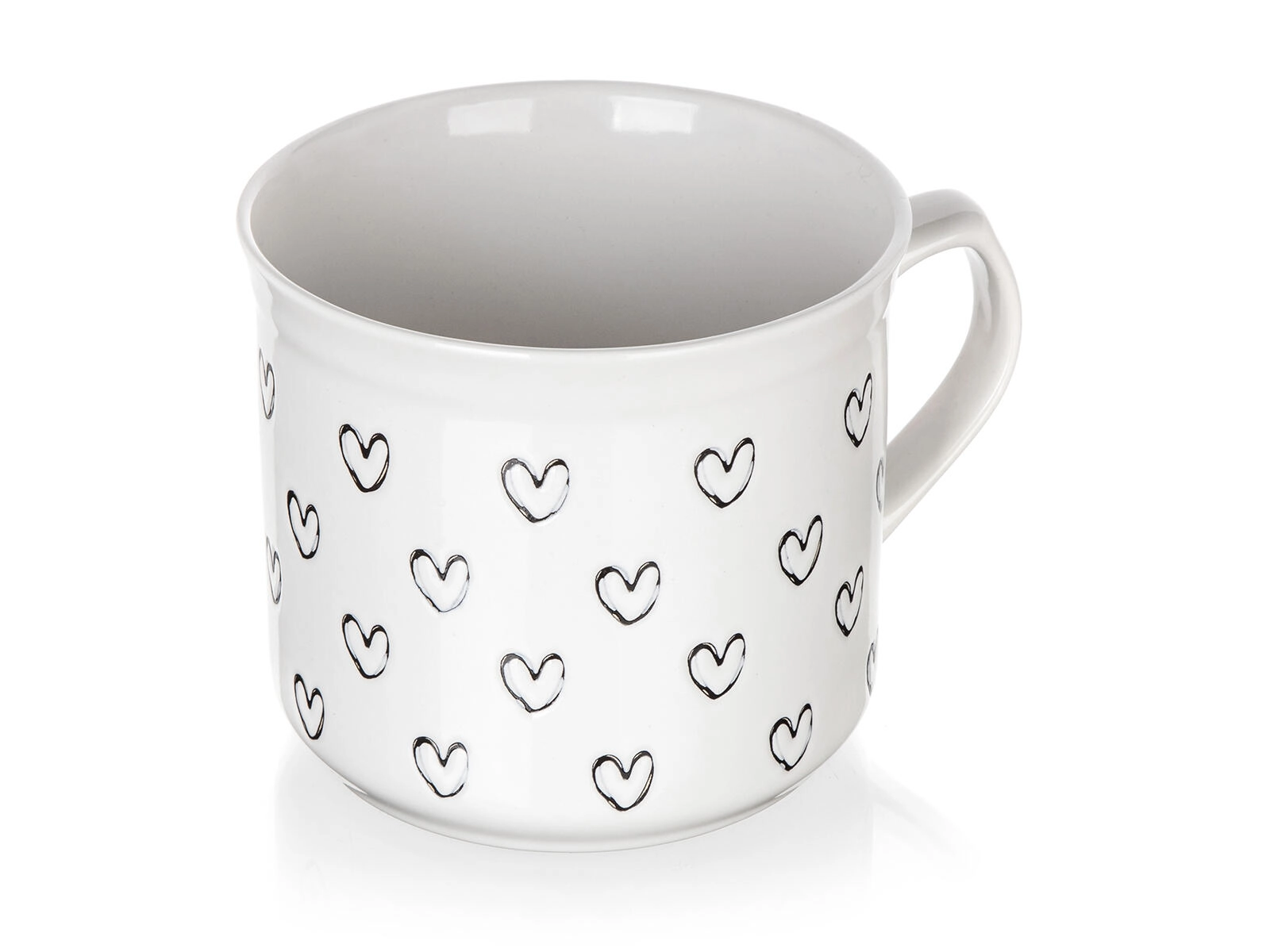 Dégustez vos boissons chaudes préférées avec style grâce à ce grand mug en céramique orné d’un dessin au trait de petits cœurs. Avec son volume de 660 ml, il est parfait pour un long café matinal ou une infusion généreuse. La glaçure brillante et la base blanche immaculée rehaussée de détails noirs apportent une élégance intemporelle à votre cuisine.