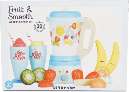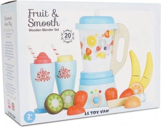 Préparez aux enfants une bonne dose de plaisir avec le mixeur à smoothies en bois LE TOY VAN. L’ensemble comprend un mixeur classique avec bol amovible, 6 morceaux de fruits à découper avec fermeture velcro, un couteau en bois et 2 verres avec pailles. Fabriqué en bois certifié FSC, fini à la main avec des peintures à l’eau non toxiques et récompensé pour sa qualité et sa valeur ludique.