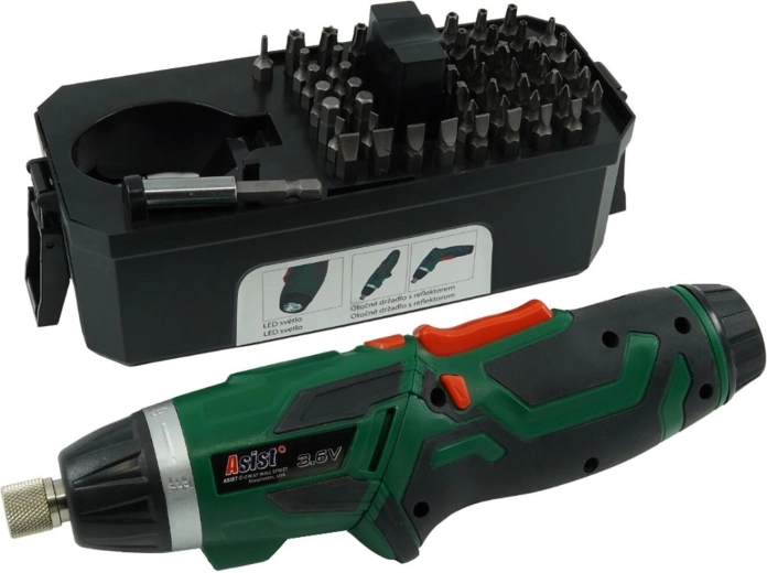 La visseuse sans fil compacte ASIST avec une tension de 3,6 V et une batterie Li‑ion 1300 mAh est idéale pour les montages et réparations à domicile. Elle offre une poignée pivotante, un éclairage LED, un indicateur de charge et une charge rapide USB en 3 à 5 heures. Le coffret comprend un jeu d’accessoires 52 pièces incluant 51 embouts et un porte-embout, pour visser et réaliser de légers perçages dans des matériaux tendres.