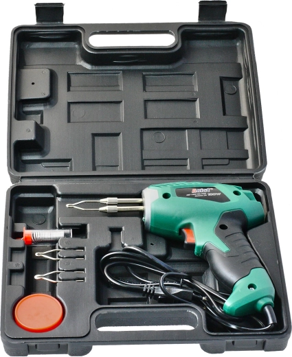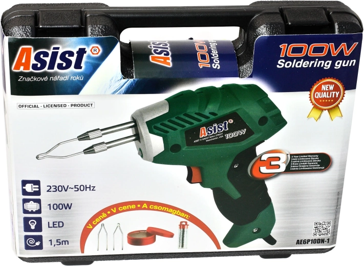 Le pistolet à souder transformateur ASIST de 100 W est idéal pour la soudure de composants électroniques, les circuits imprimés et les petites réparations. Il offre un réchauffement rapide, une prise en main ergonomique avec poignée Softgrip, un éclairage LED de la zone de travail et un coffret pratique avec de nombreux accessoires pour un travail confortable et précis.