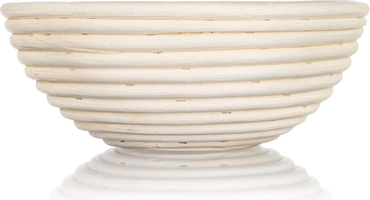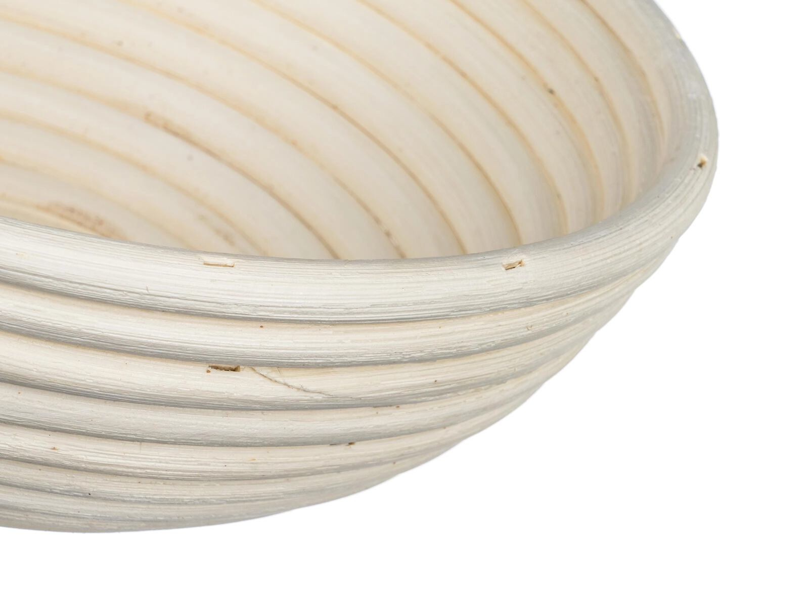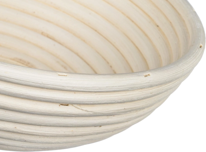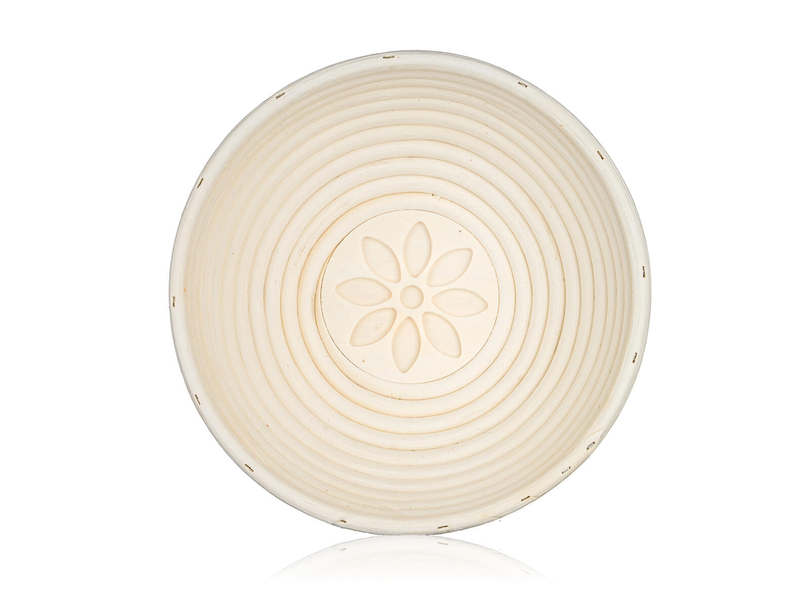 Panier rond en rotin naturel de 21 cm de diamètre avec un décor floral au fond, idéal pour la fermentation de la pâte à pain. Le rainurage en spirale favorise une levée homogène et crée un motif attrayant sur la croûte. Léger, respirant et facile à entretenir – il suffit de l’essuyer avec un chiffon humide.