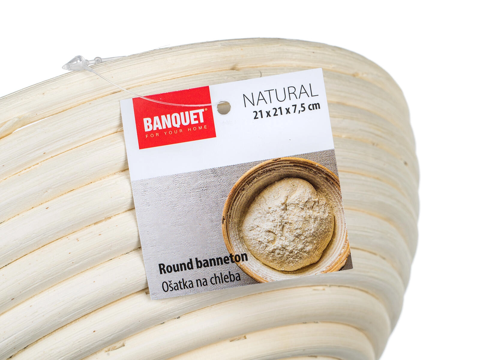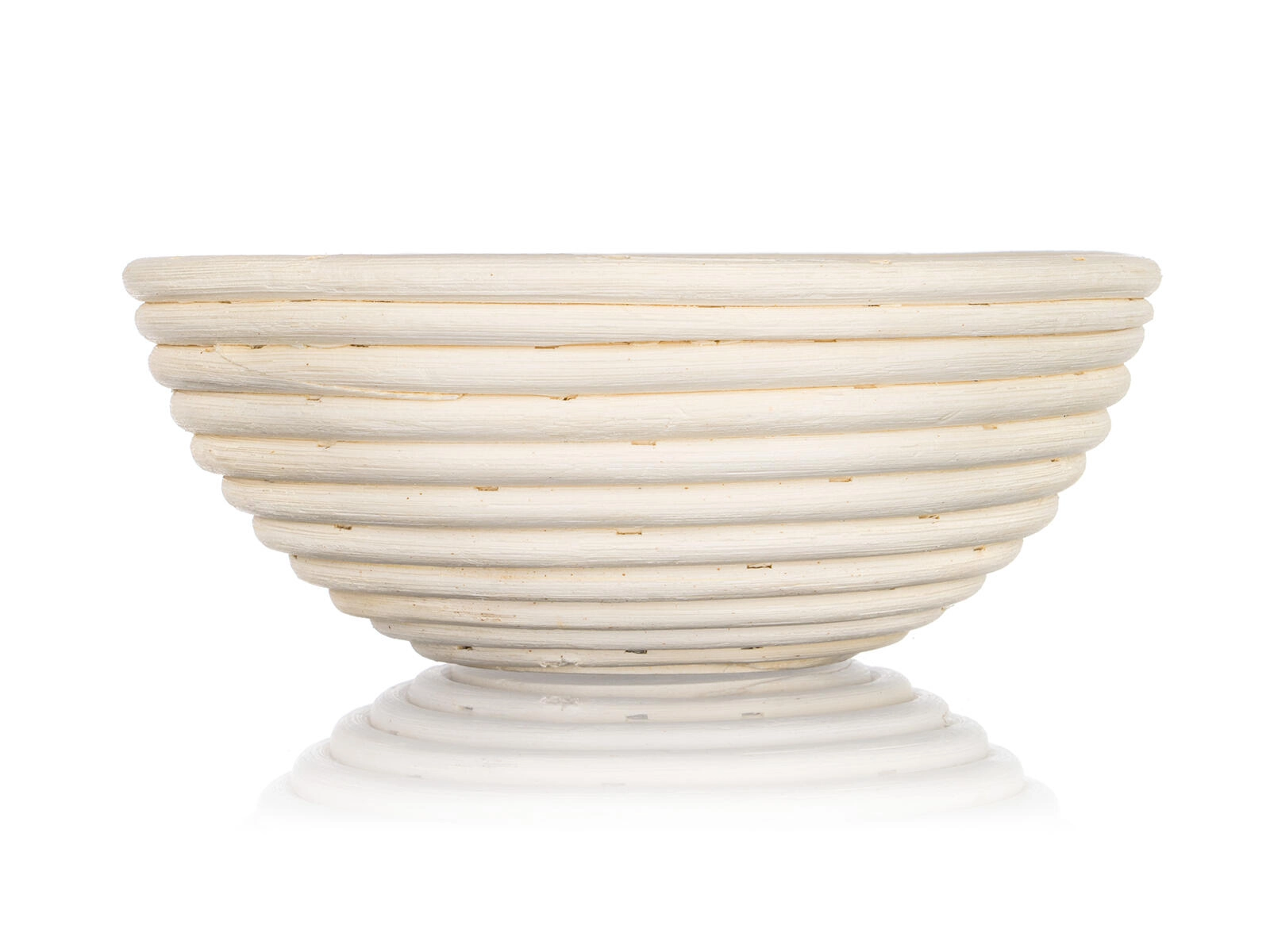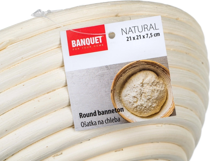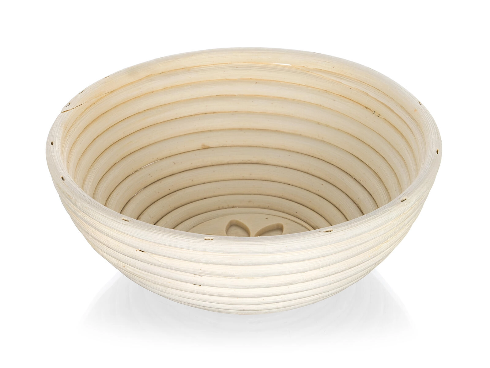 Panier rond en rotin naturel de 21 cm de diamètre avec un décor floral au fond, idéal pour la fermentation de la pâte à pain. Le rainurage en spirale favorise une levée homogène et crée un motif attrayant sur la croûte. Léger, respirant et facile à entretenir – il suffit de l’essuyer avec un chiffon humide.