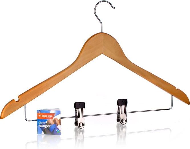 Cintre pratique en bois avec crochet en métal et pinces chromées pour un rangement net des robes, pantalons et jupes. Il offre une structure solide, une fixation délicate et des dimensions universelles 44 × 28 cm pour une utilisation quotidienne dans la penderie.