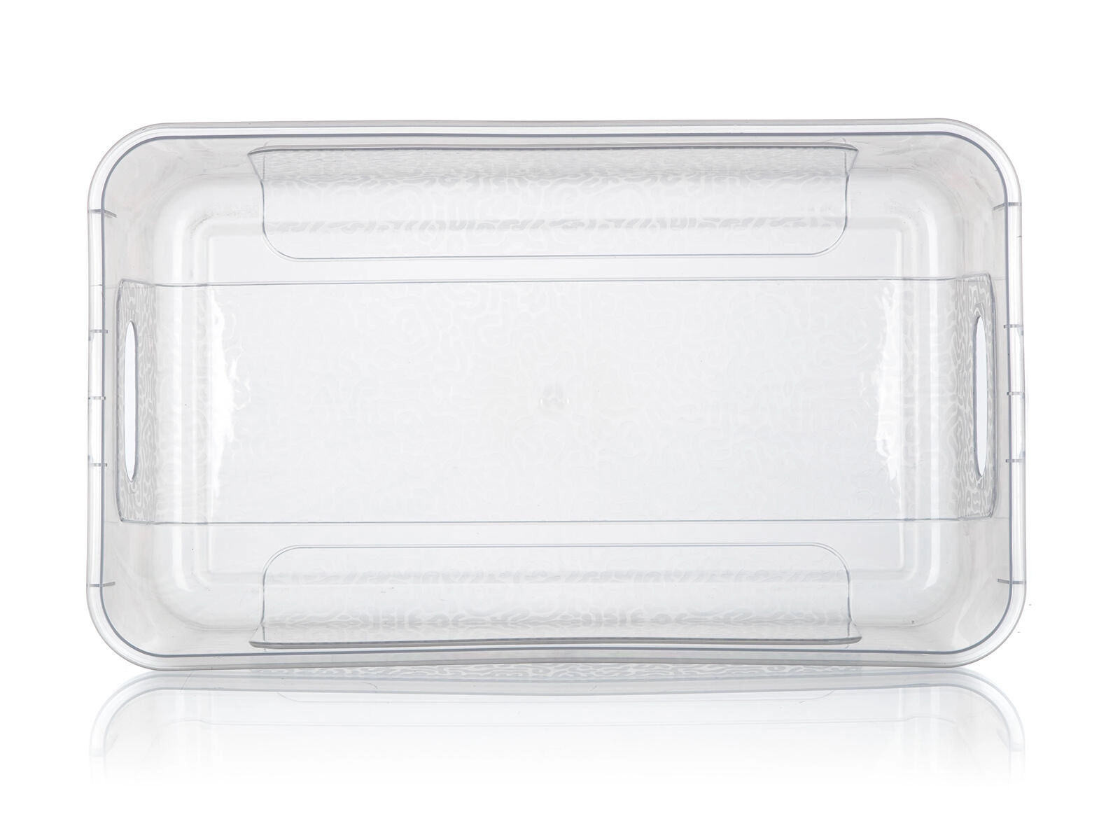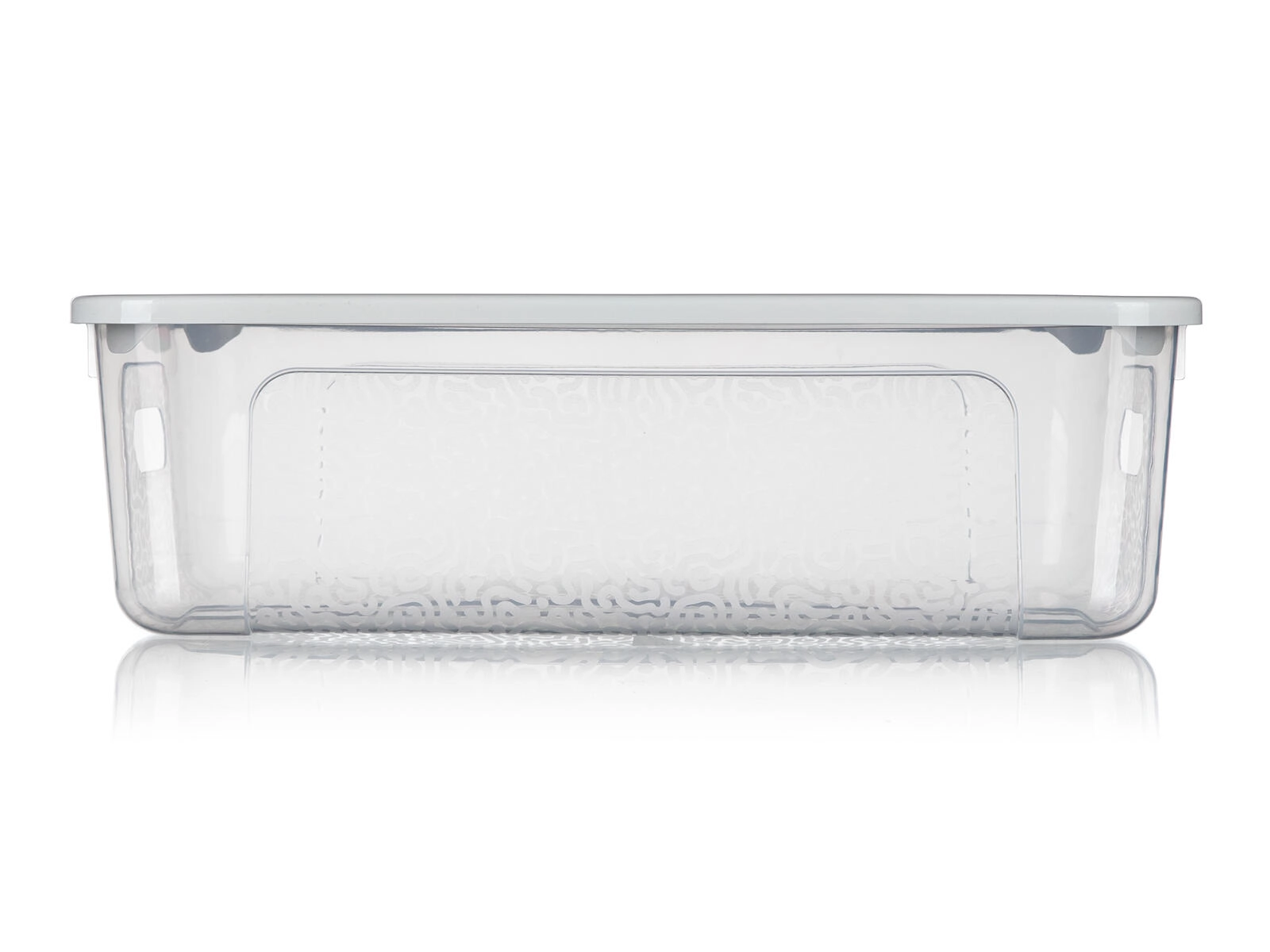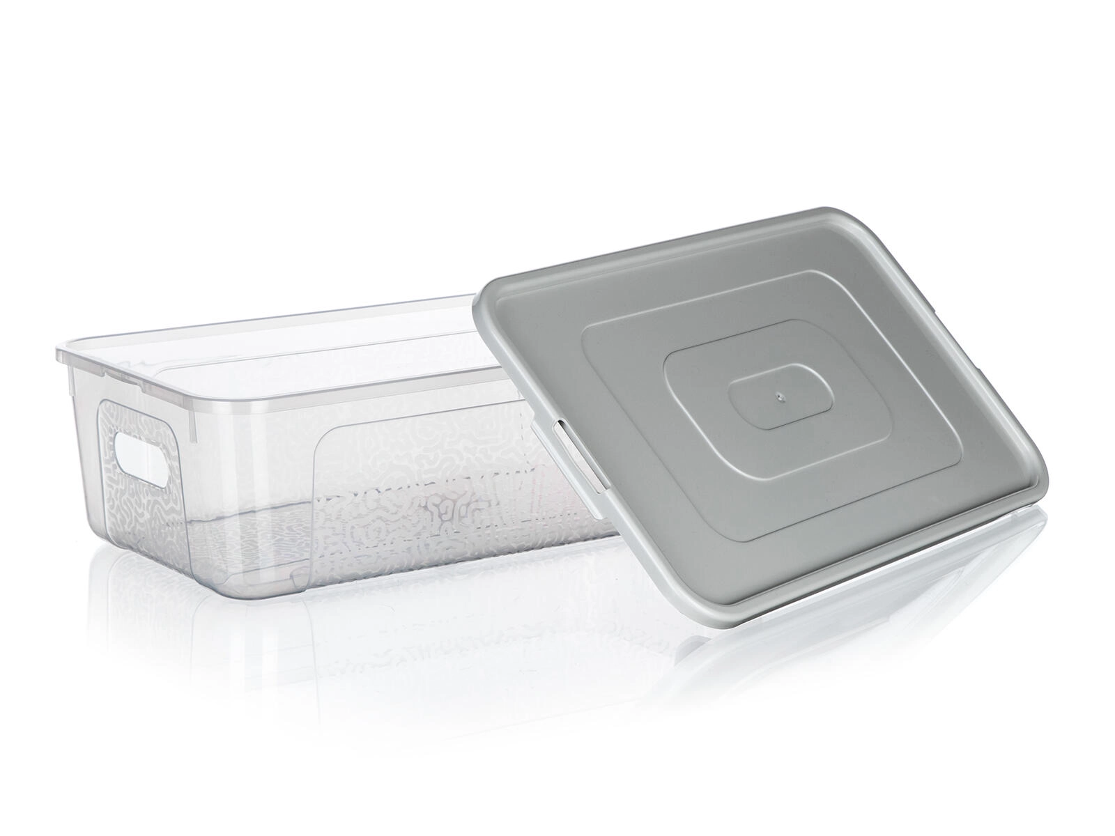 La boîte est fabriquée en plastique résistant, possède des poignées latérales intégrées pour une manipulation aisée et, grâce à sa forme basse et rectangulaire, convient aux étagères comme à l’espace sous le lit. Le couvercle reste bien en place, gardant les objets protégés de la poussière et des renversements.