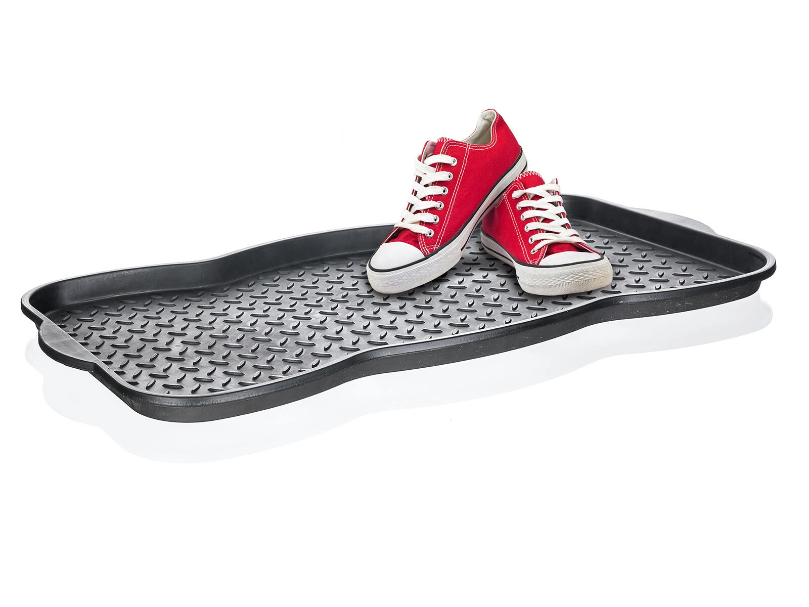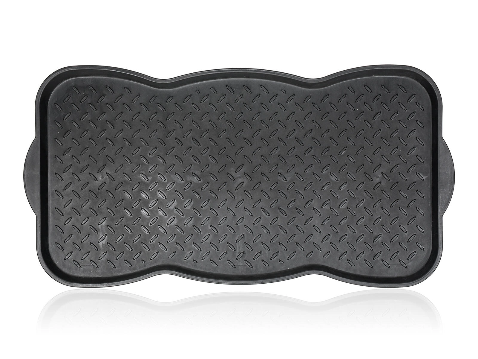 Pratique égouttoir à chaussures BRILANZ aux dimensions 75 × 38 cm, protège le sol et le coffre de voiture de la boue et de l’eau. Grâce à son rebord surélevé et à sa texture antidérapante, il retient efficacement saletés et humidité, se nettoie facilement et est résistant en plastique dans une élégante couleur noire.