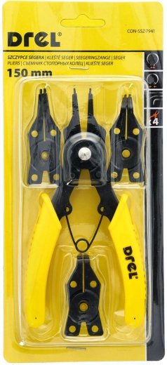 Pince universelle pour circlips DREL de 150 mm pour un travail précis et confortable. Grâce aux mâchoires interchangeables, elle gère les circlips internes et externes et offre un changement rapide des mâchoires ainsi qu'une poignée ergonomique pour une prise en main sûre.