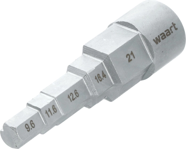 Le design à paliers permet de passer rapidement entre 3/8", 29/68", 1/2", 21/32" et 27/32" (9,6–21 mm) sans changer d’outil.