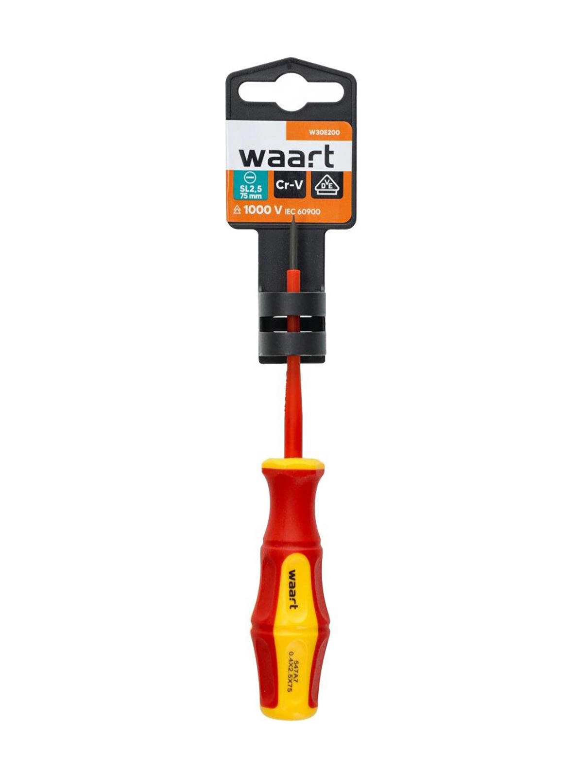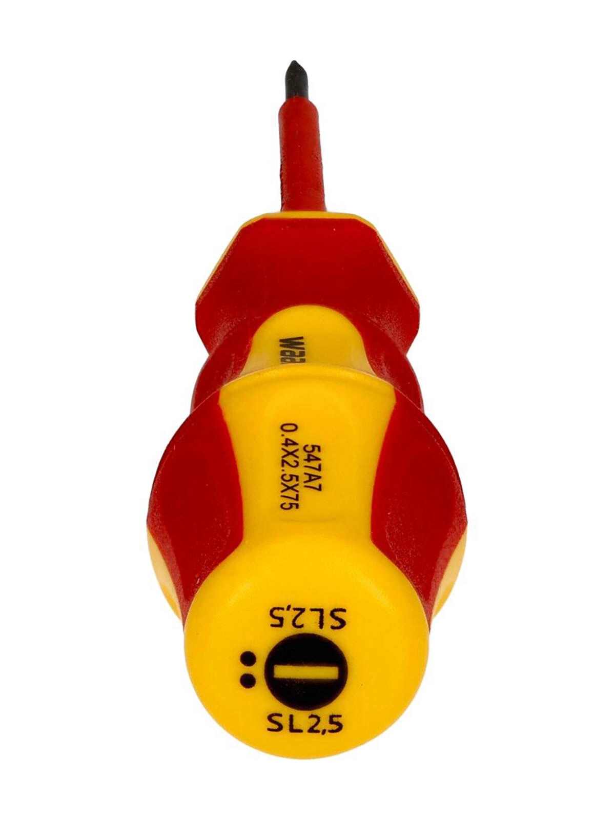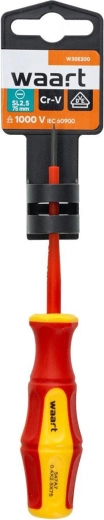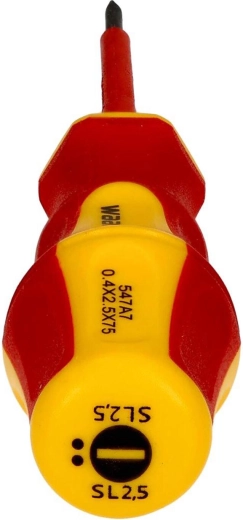 Tournevis plat électrotechnique professionnel SL 2,5 × 75 mm en acier CrV de qualité avec certification VDE jusqu’à 1000 V. La poignée ergonomique en TPR et PP assure une prise en main sûre, du confort et un travail en toute sécurité sur les équipements électriques. Idéal pour les vis à fente (plates) dans les tableaux, prises et interrupteurs.