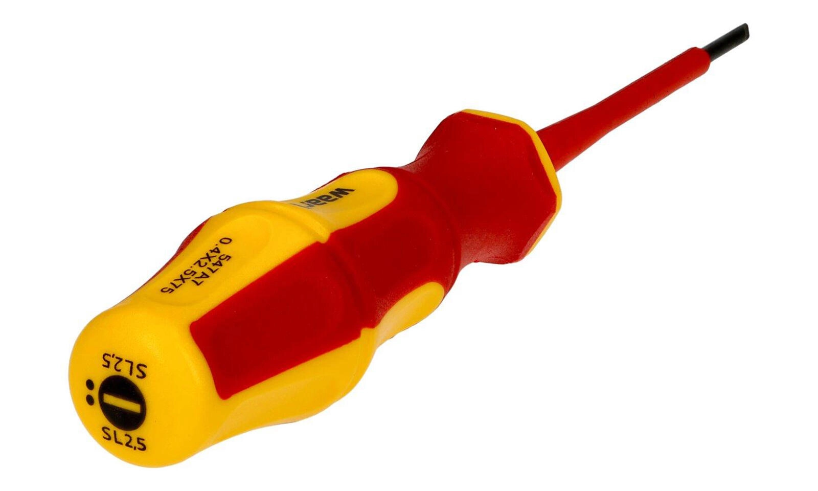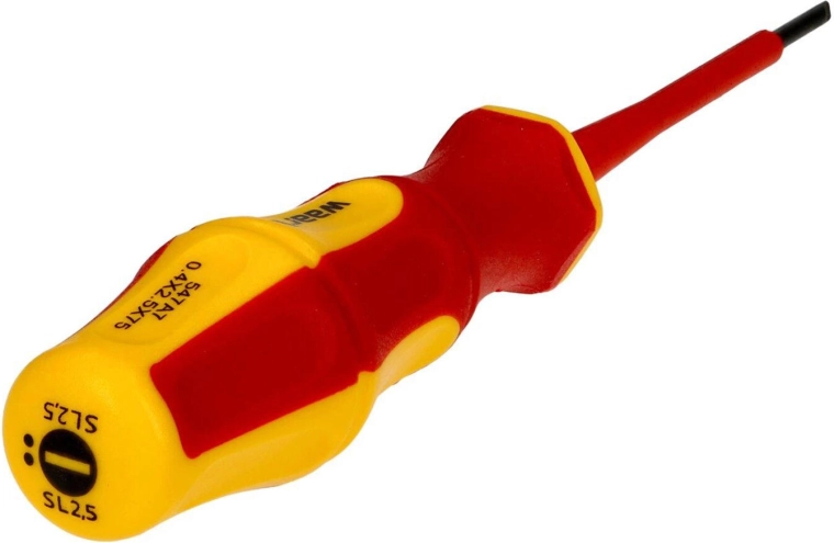 La poignée ergonomique en TPR/PP associe une prise antidérapante sûre à un excellent contrôle du couple. La pointe de type SL 2,5 est destinée au serrage et au desserrage des vis à fente, idéale pour les travaux électriques fins, borniers et barrettes de connexion.