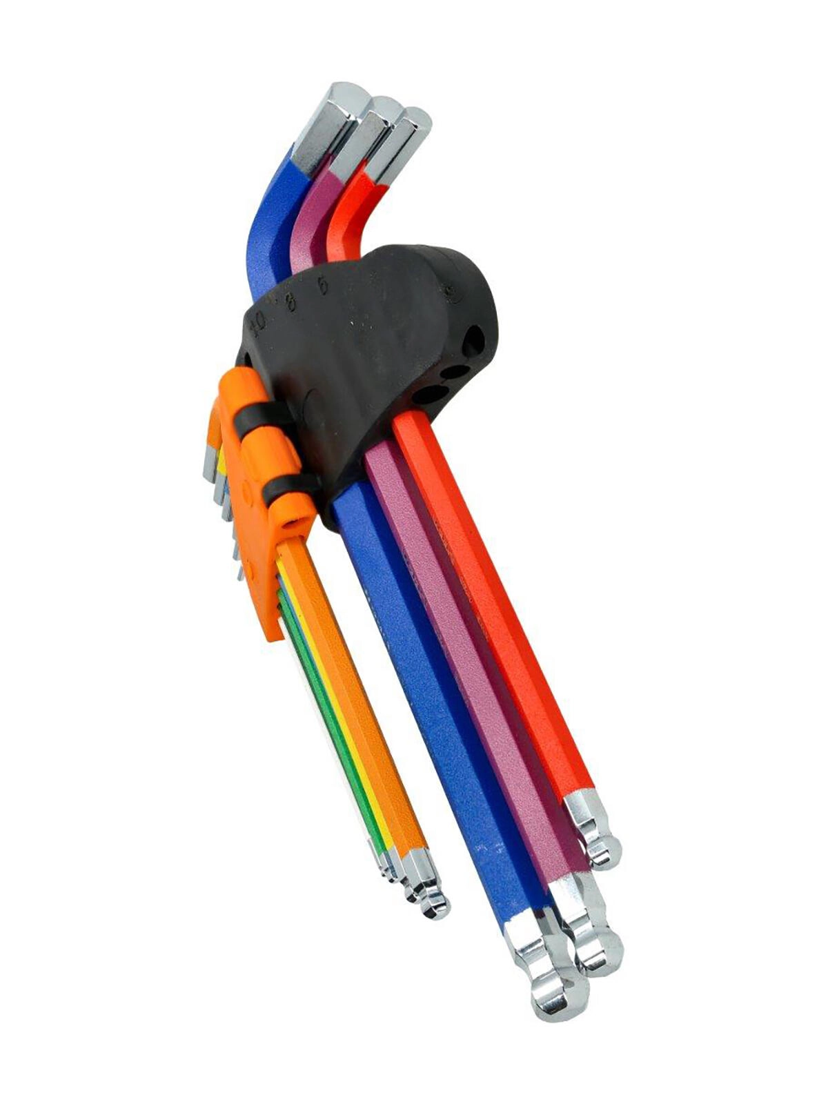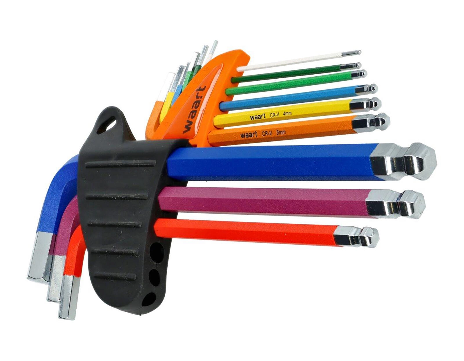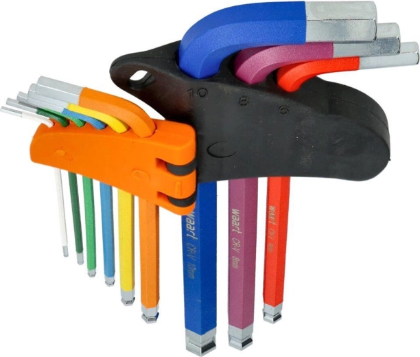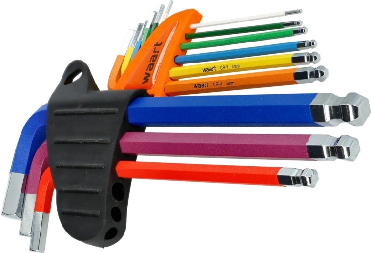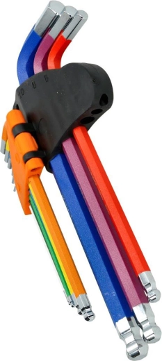 Chaque clé est codée par couleur pour une identification immédiate de la bonne dimension. Le profil à embout boule permet de travailler sous un angle jusqu’à 25°, ce qui facilite le serrage ou le desserrage des vis là où les clés classiques ne suffisent pas. Le long bras offre un meilleur effet de levier pour un couple plus élevé et un accès confortable aux vis profondément encastrées.