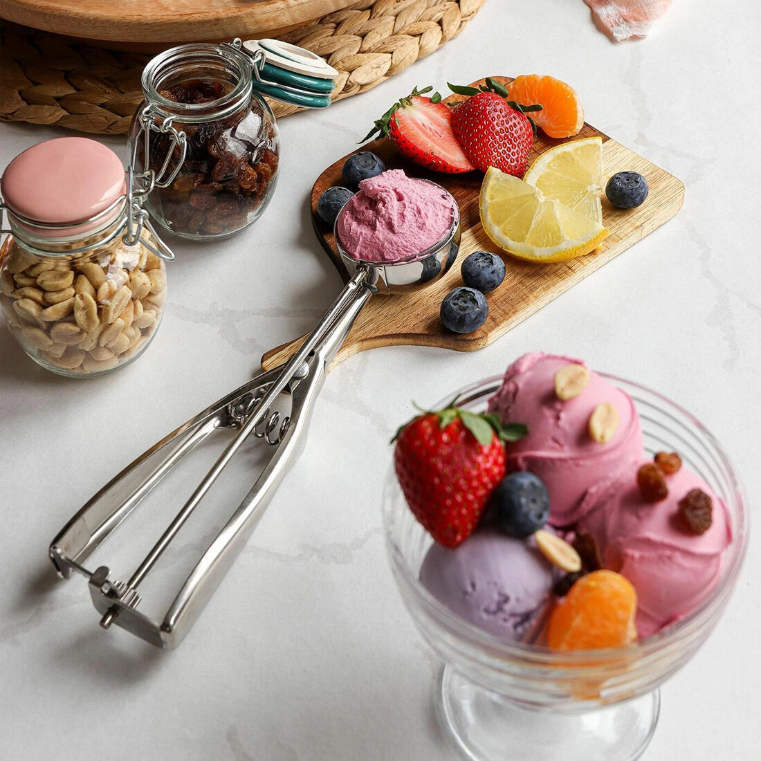 Avec un diamètre de 6 cm, vous formerez des boules de glace, de sorbet et d’autres gourmandises glacées belles et régulières. Elle est parfaite pour le service des desserts lors de fêtes, de réunions de famille ou pour un usage quotidien à la maison.