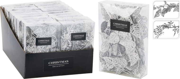 Élégante guirlande décorative à feuilles de 180 cm, parfaite sur une table, une fenêtre ou un sapin. Sa surface argentée scintillante crée une ambiance festive et se combine facilement avec d’autres décors d’hiver. Disponible en mix de 2 variantes pour des compositions originales.