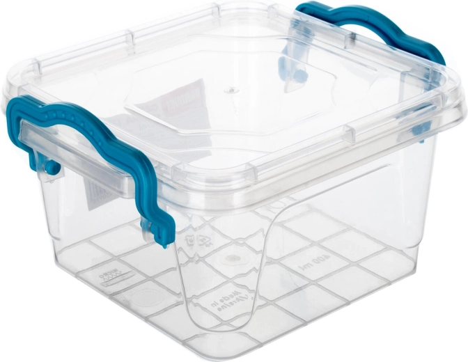 Boîte de cuisine pratique d’une capacité de 0,4 l, de forme carrée avec un corps transparent, équipée de poignées turquoise pour un transport aisé. Convient pour le congélateur jusqu’à −25 °C et le micro-ondes jusqu’à +95 °C, idéale pour conserver des aliments et des restes de repas.