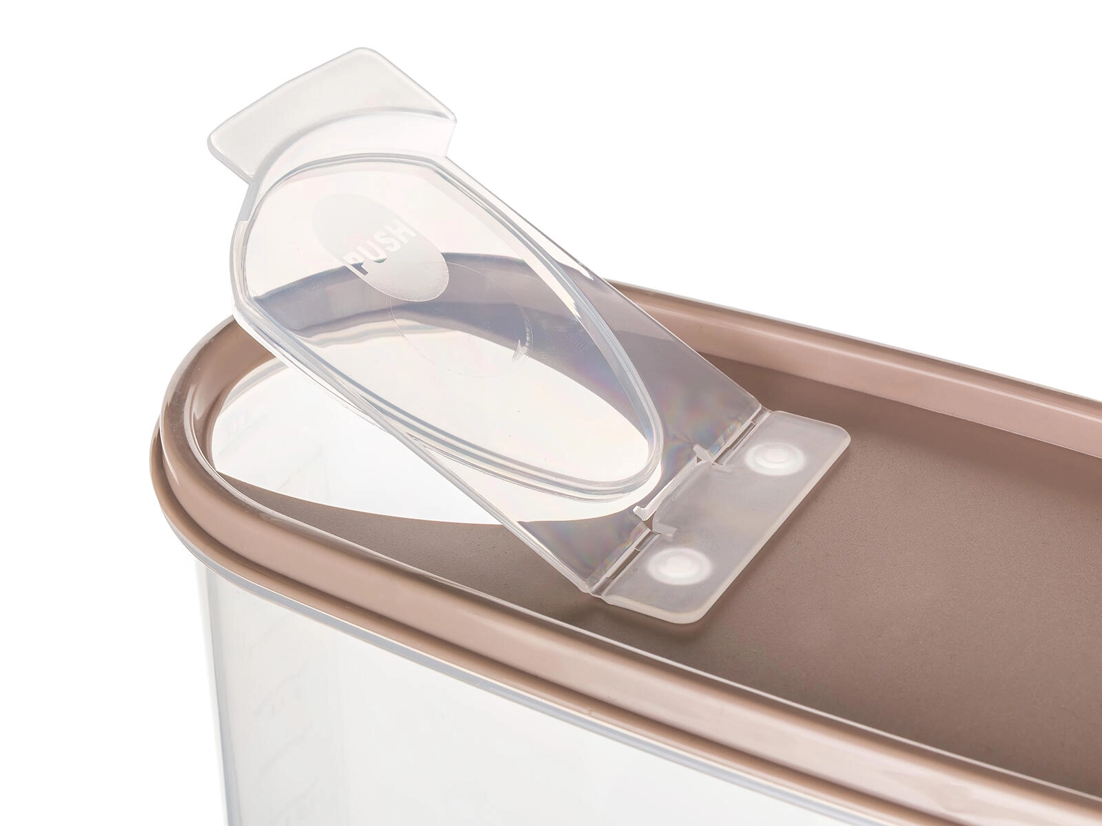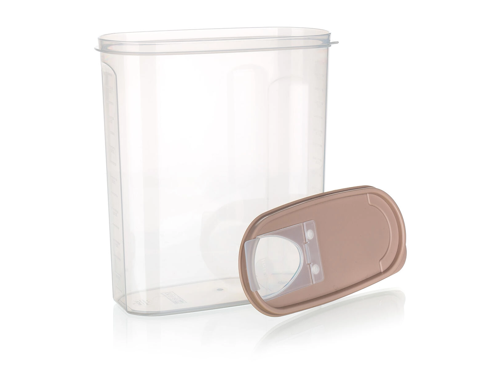 Boîte transparente pratique pour aliments secs Riva d’une capacité de 4 l avec couvercle marron, idéale pour stocker pâtes, riz, farine ou légumineuses. Grâce au corps transparent, vous gardez toujours une vue d’ensemble du contenu et de la quantité, tandis que le couvercle avec clapet d’ouverture pratique permet un dosage facile et assure la fraîcheur et la protection contre l’humidité. La fabrication robuste en plastique est légère, résistante et facile à entretenir.