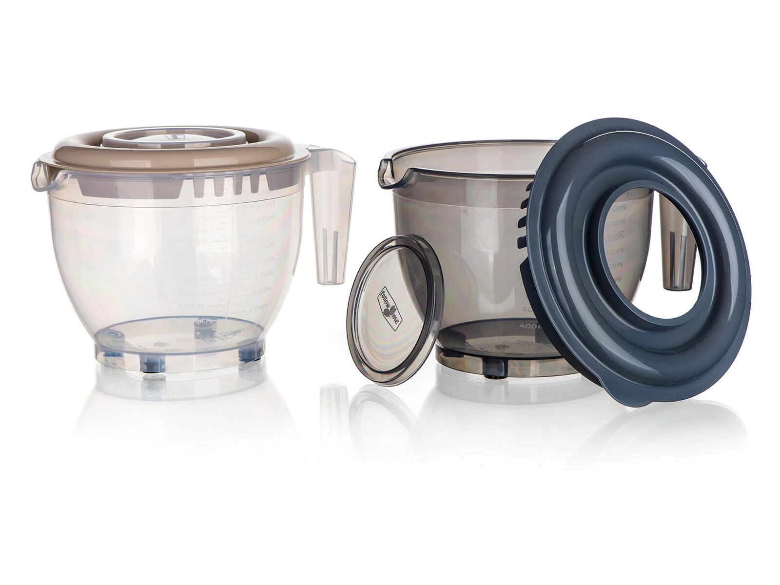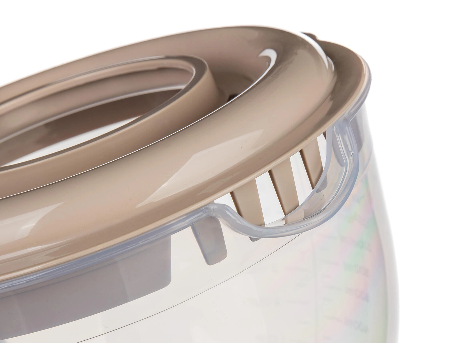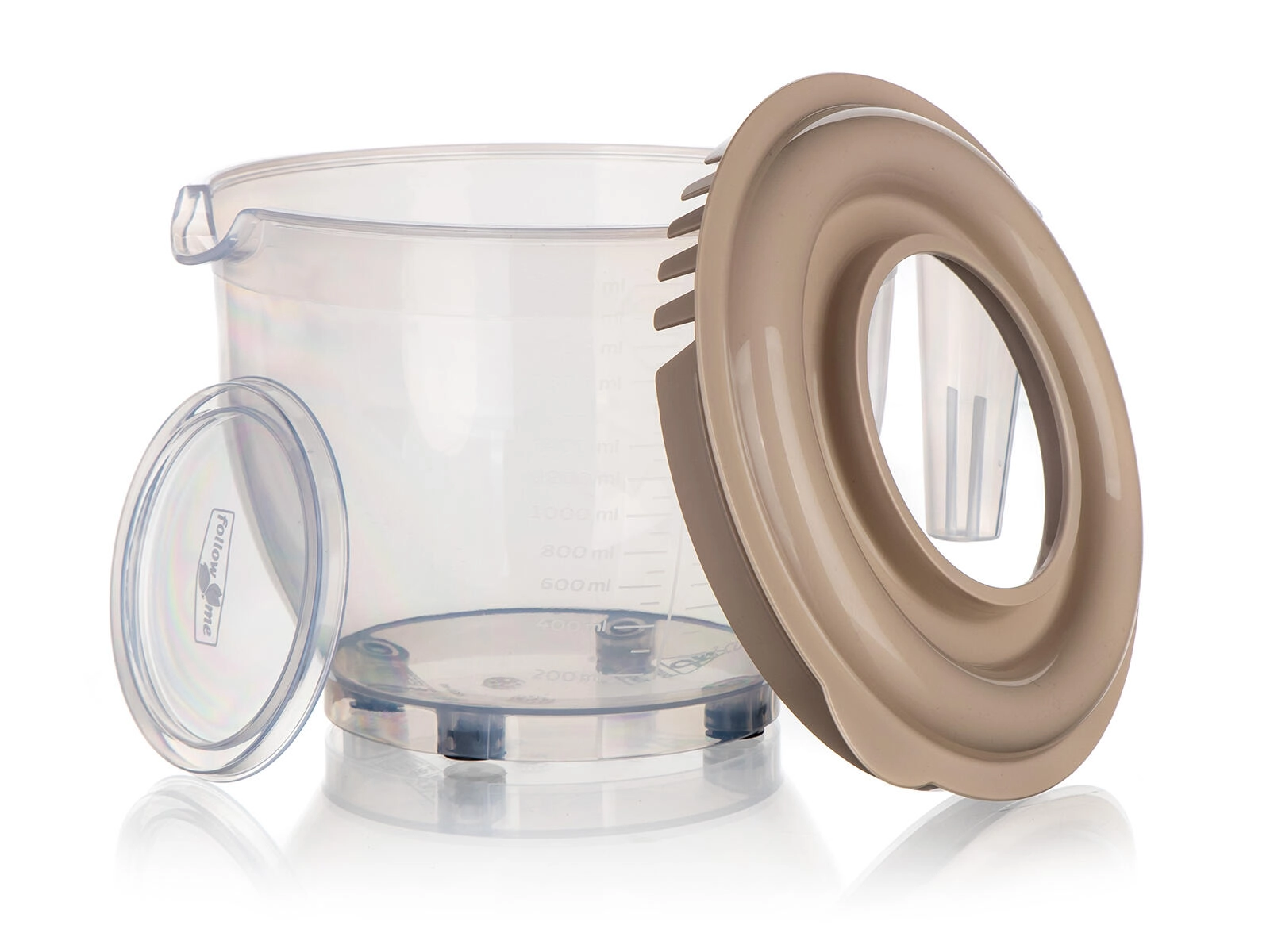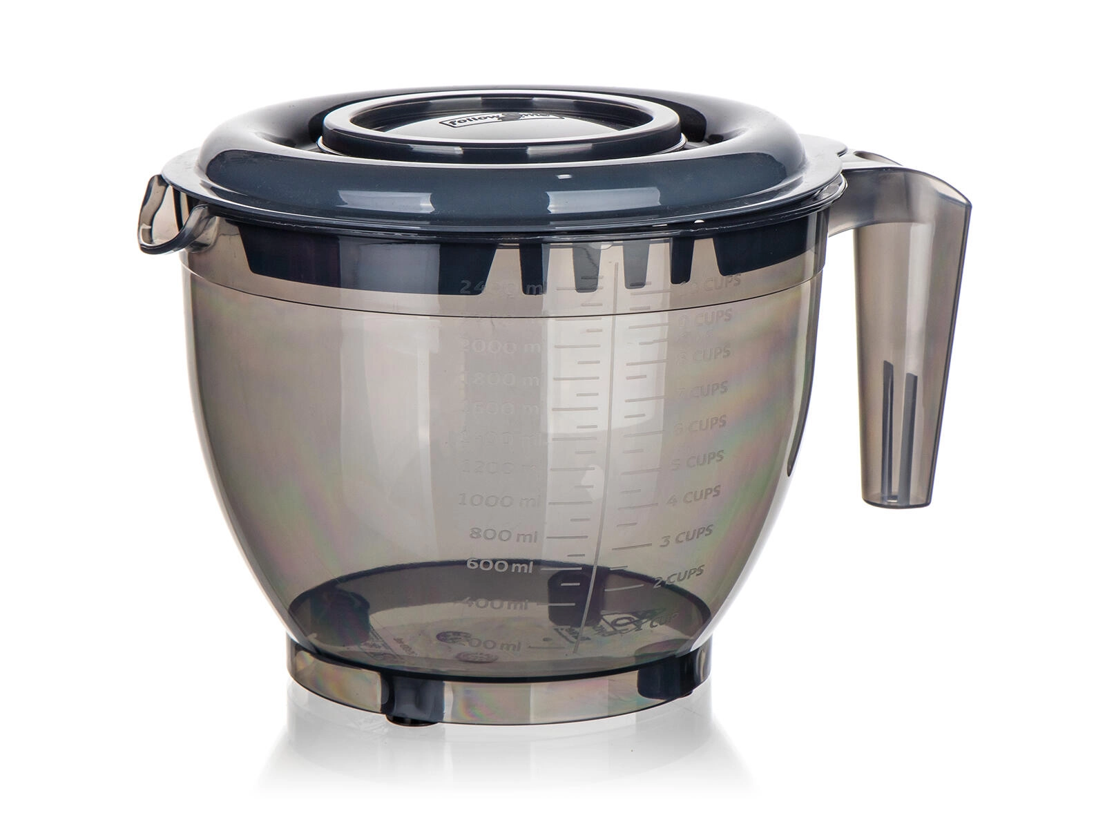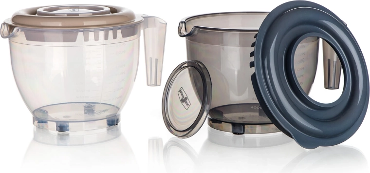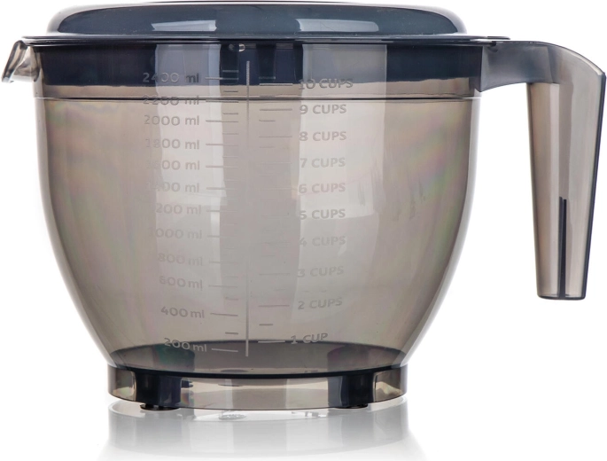 La base stable avec pieds antidérapants maintient fermement le bol en place, la poignée ergonomique garantit une prise sécurisée et le couvercle double avec ouverture aide à fouetter sans éclaboussures et à ajouter les ingrédients progressivement. Le plastique résistant est léger, facile à nettoyer et idéal pour toute cuisine domestique.