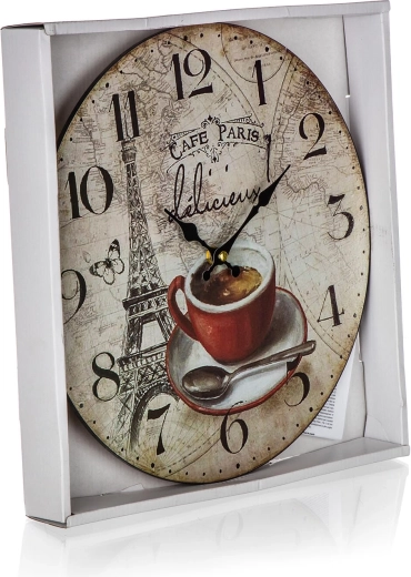 L’horloge murale élégante CAFE PARIS de 34 cm de diamètre apporte à votre intérieur le style d’un café parisien. Elle offre un cadran lisible, un motif pleine surface et un alimentation facile par pile AA (non incluse). Parfaite pour la cuisine, le salon et les intérieurs de cafés.