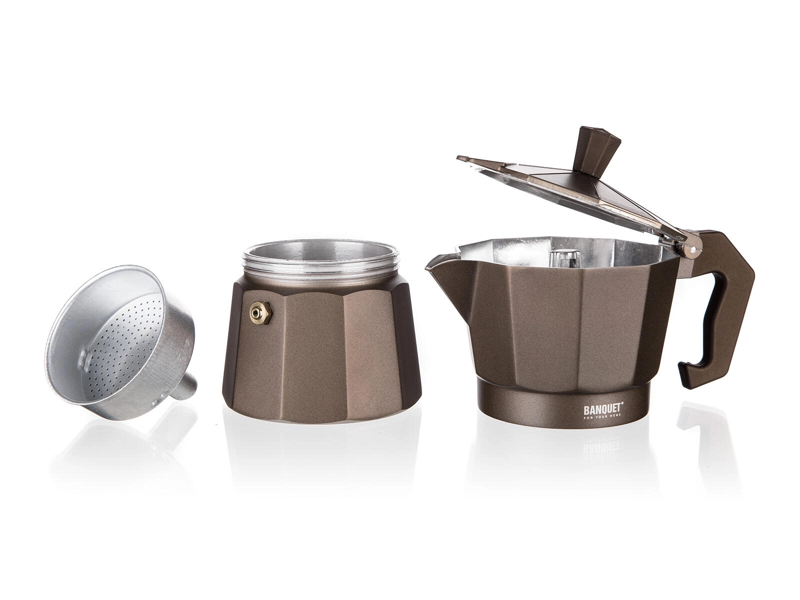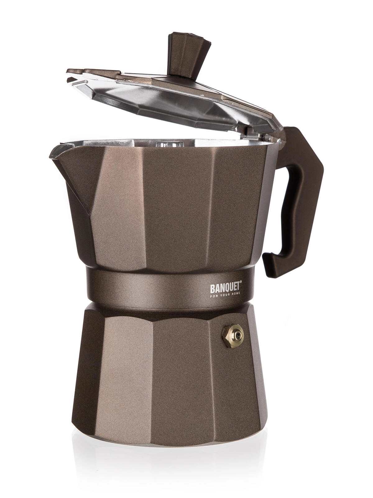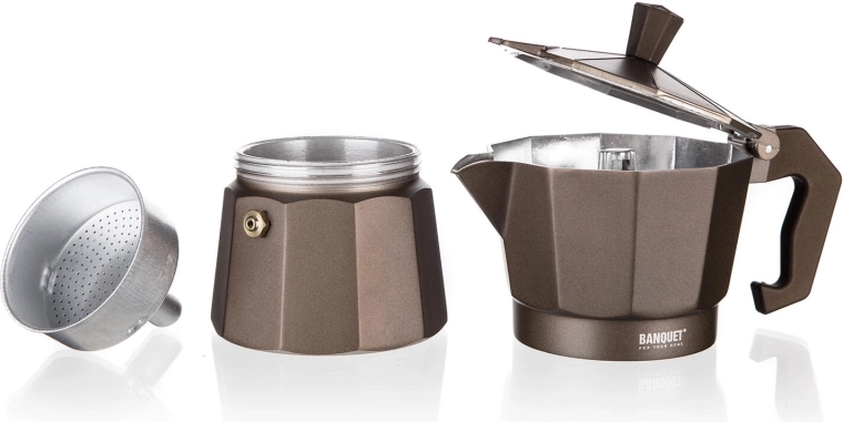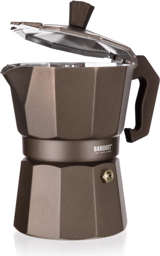 Profitez d’un espresso authentique avec la cafetière moka BANQUET CAMPI. La construction classique en aluminium conduit rapidement la chaleur et acquiert après quelques utilisations une légère patine pour une saveur de café authentique. Grâce à la valve de sécurité et à la poignée confortable, la préparation du café est simple et sûre.