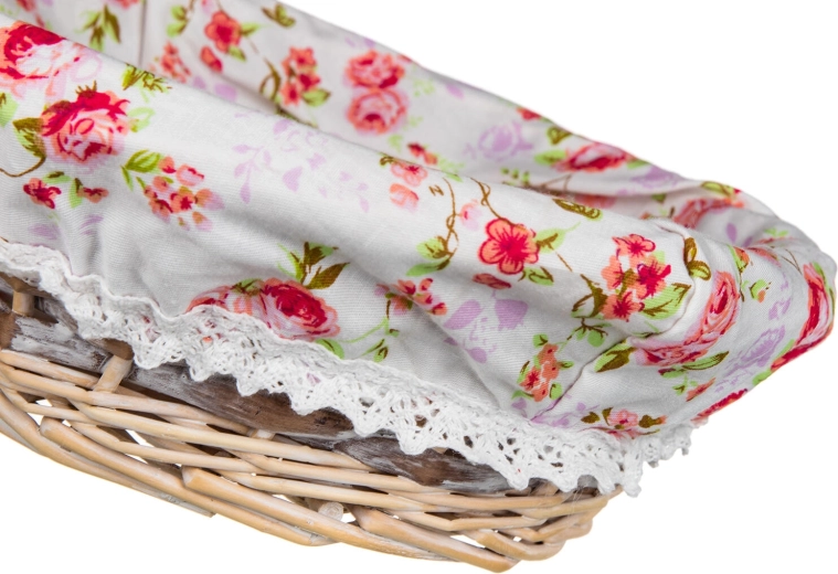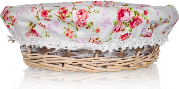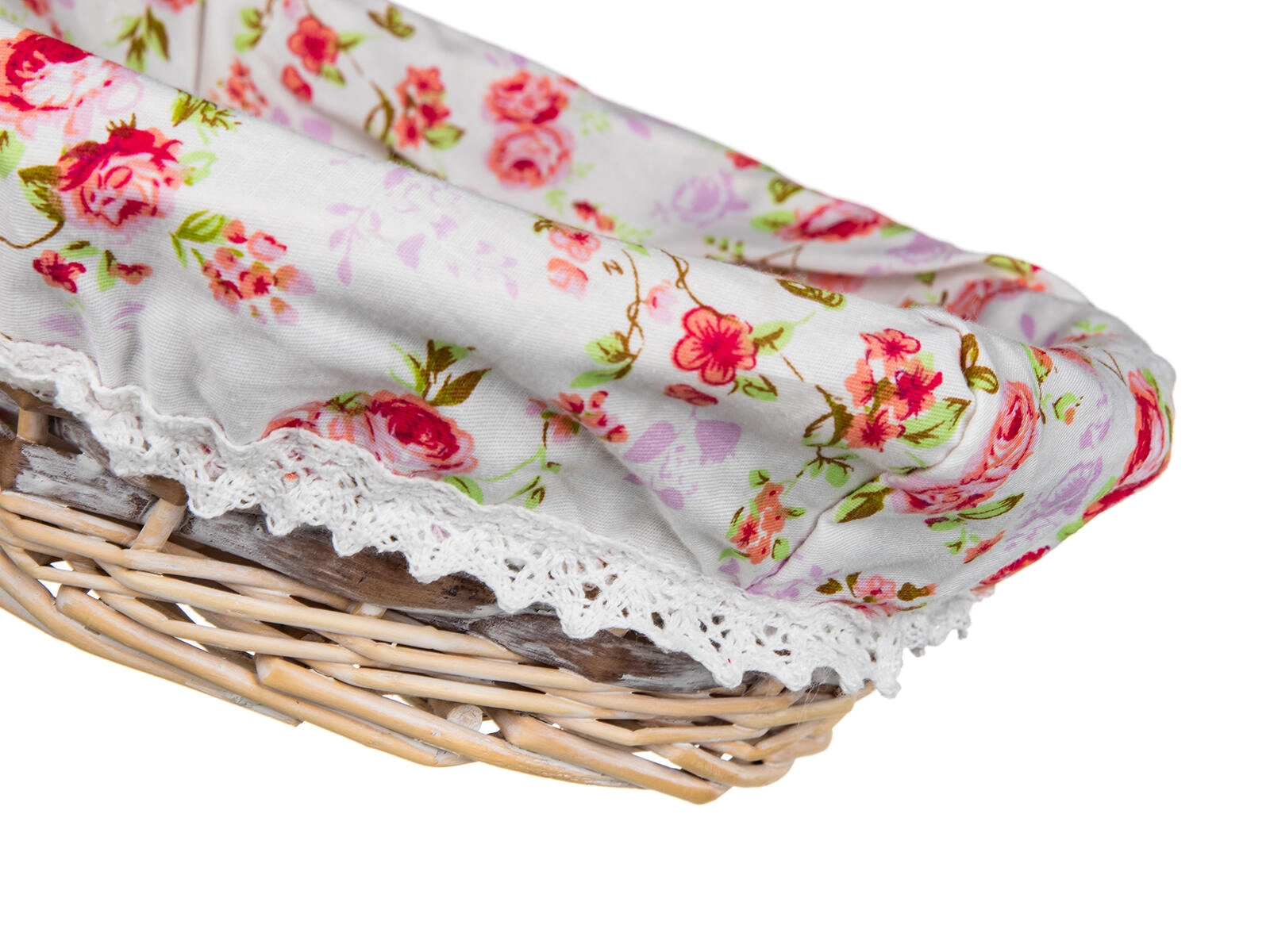 Charmant panier rond en osier avec doublure en coton amovible, de couleur blanche avec motif floral rose et délicate bordure en dentelle. Il se distingue dans les intérieurs romantiques, campagnards ou scandinaves et s’accorde facilement avec d’autres accessoires de la maison.