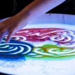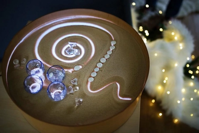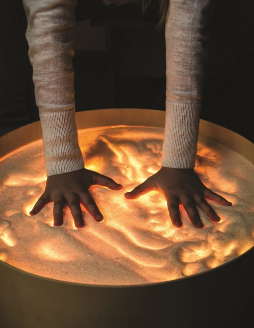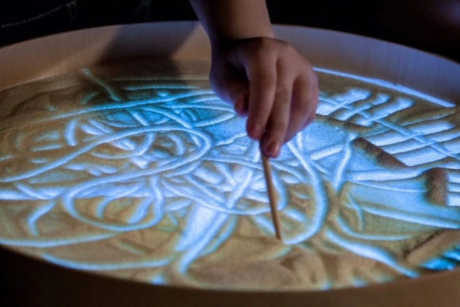 Sur le plateau, on peut dessiner avec les doigts, des pinceaux ou des outils en plastique, travailler avec du sable, des cailloux et d’autres matériaux sans crainte du désordre grâce au rebord surélevé. La table sert aussi de scène lumineuse pour un petit théâtre, d’éclairage décoratif pour la chambre d’enfant ou d’outil thérapeutique pour développer la perception des couleurs, des formes et des motifs.