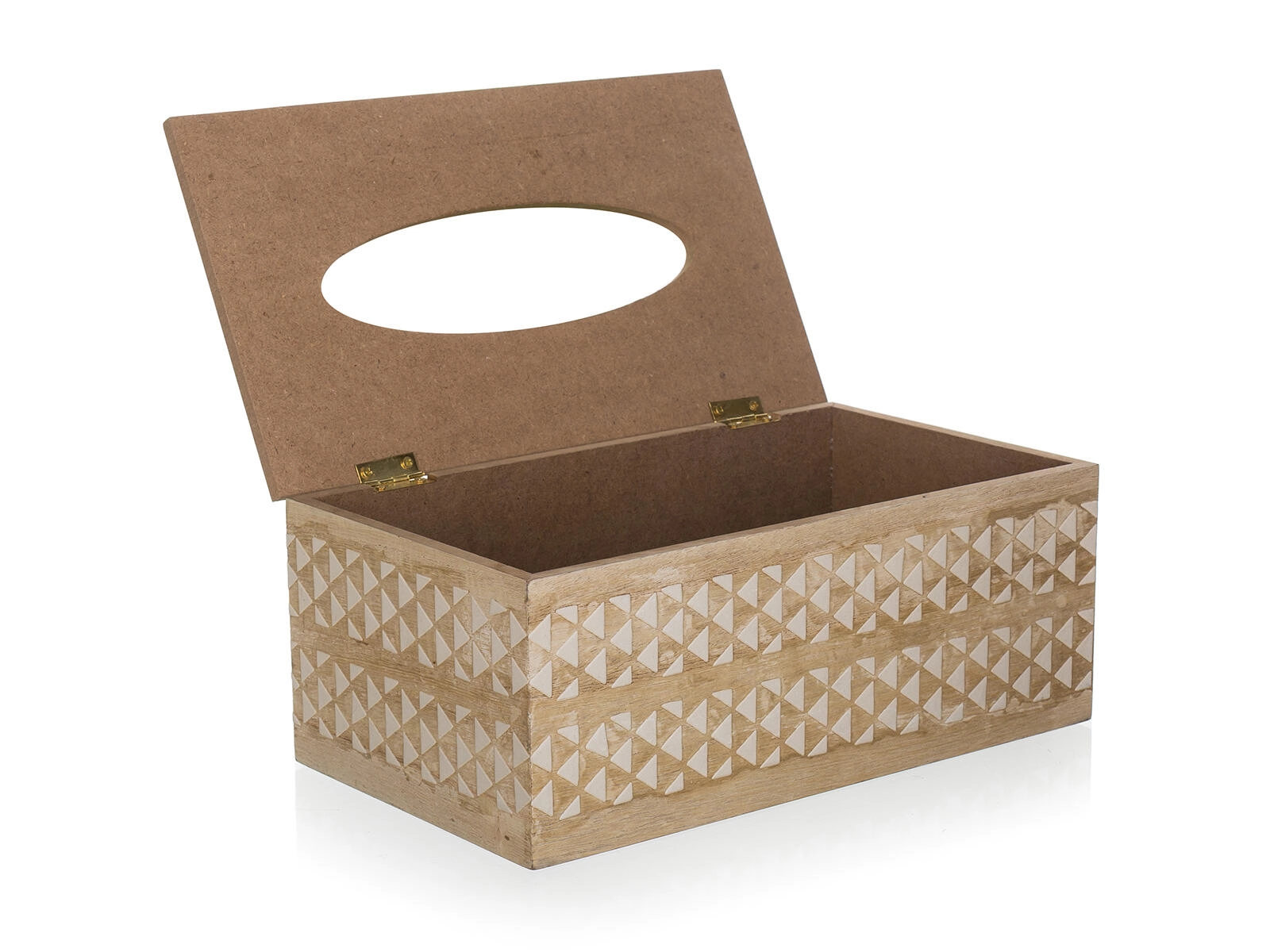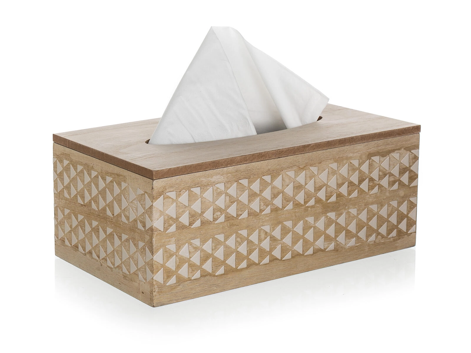 Élégante boîte en bois pour mouchoirs en papier qui apporte style et ordre à votre intérieur. Grâce au couvercle ouvrant à charnières, elle se recharge facilement et son aspect naturel avec un ornement géométrique blanc s’adapte à tous les foyers. Dimension universelle pour les boîtes standard, distribution aisée via l’ouverture ovale et design décoratif pour un aspect propre et soigné de la pièce.