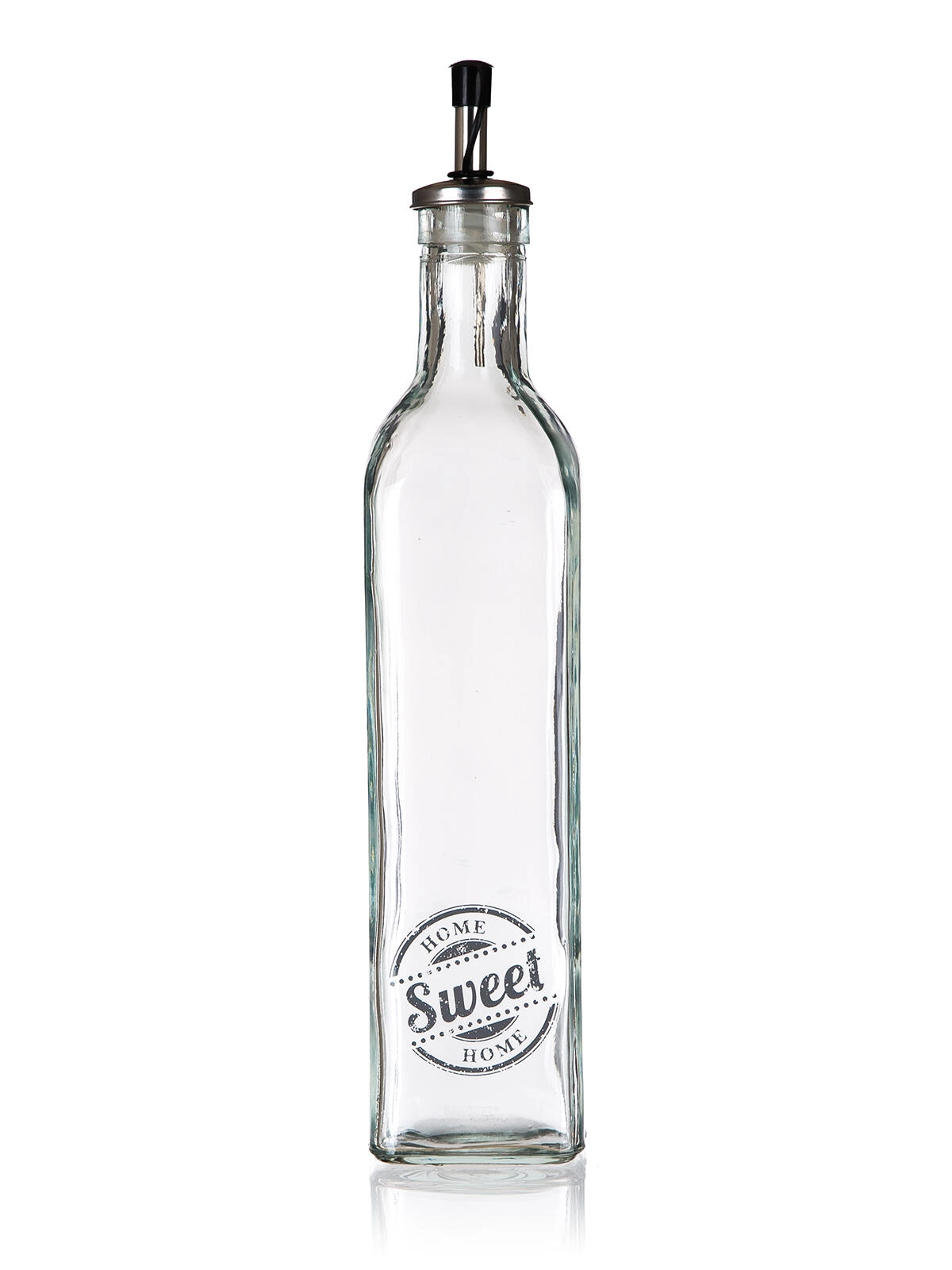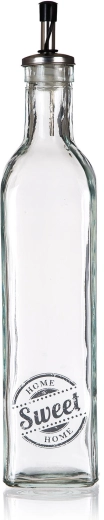 Bouteille en verre élégante pour l’huile avec décor SWEET HOME d’une capacité de 500 ml, un accessoire pratique pour toute cuisine. Elle a une forme carrée pour la stabilité et une prise en main confortable, et est équipée d’un buse verseuse en métal avec un bouchon en plastique et un joint pour un dosage propre et précis sans gouttes.