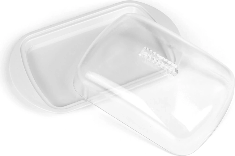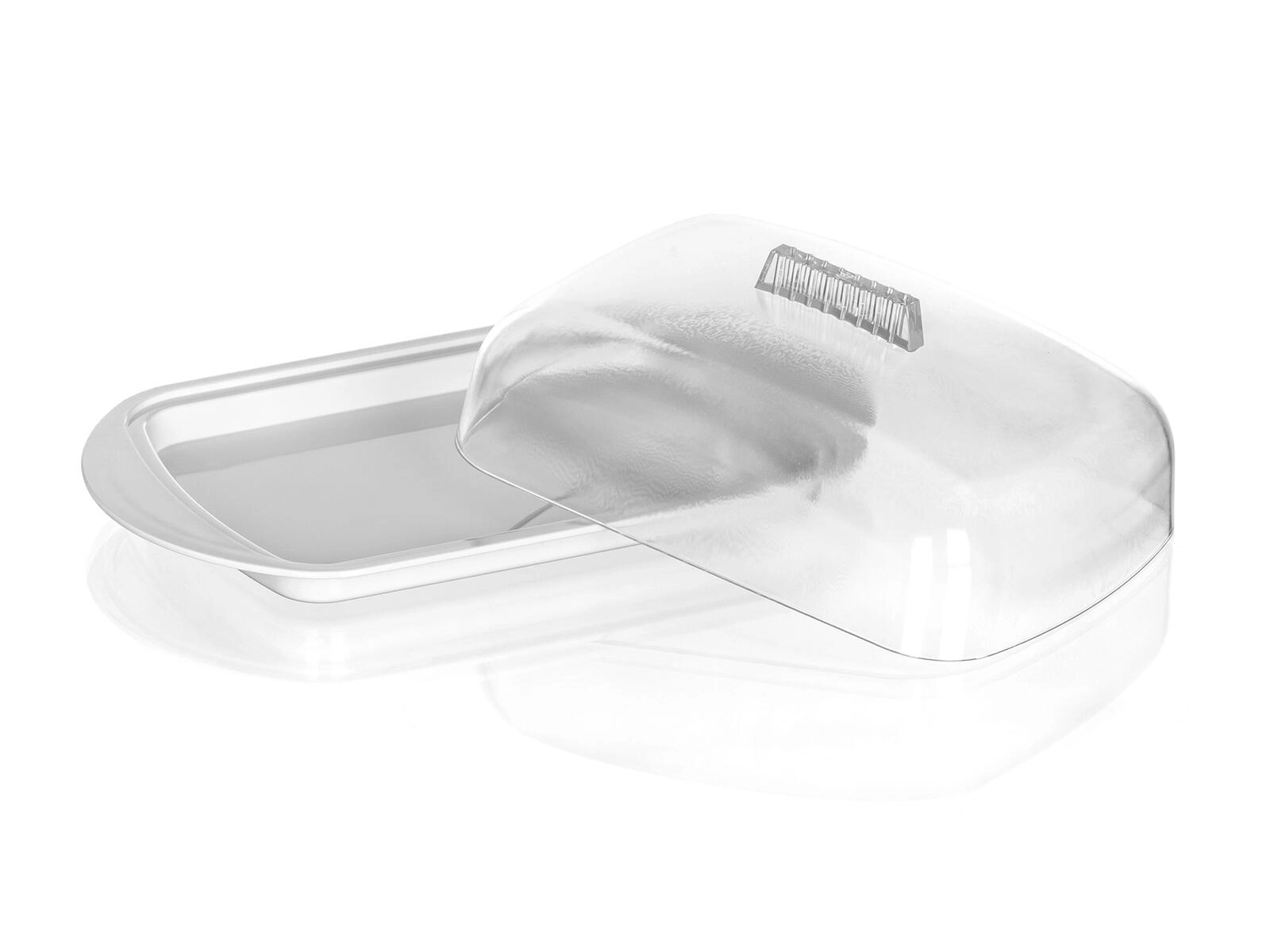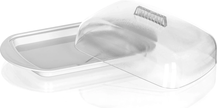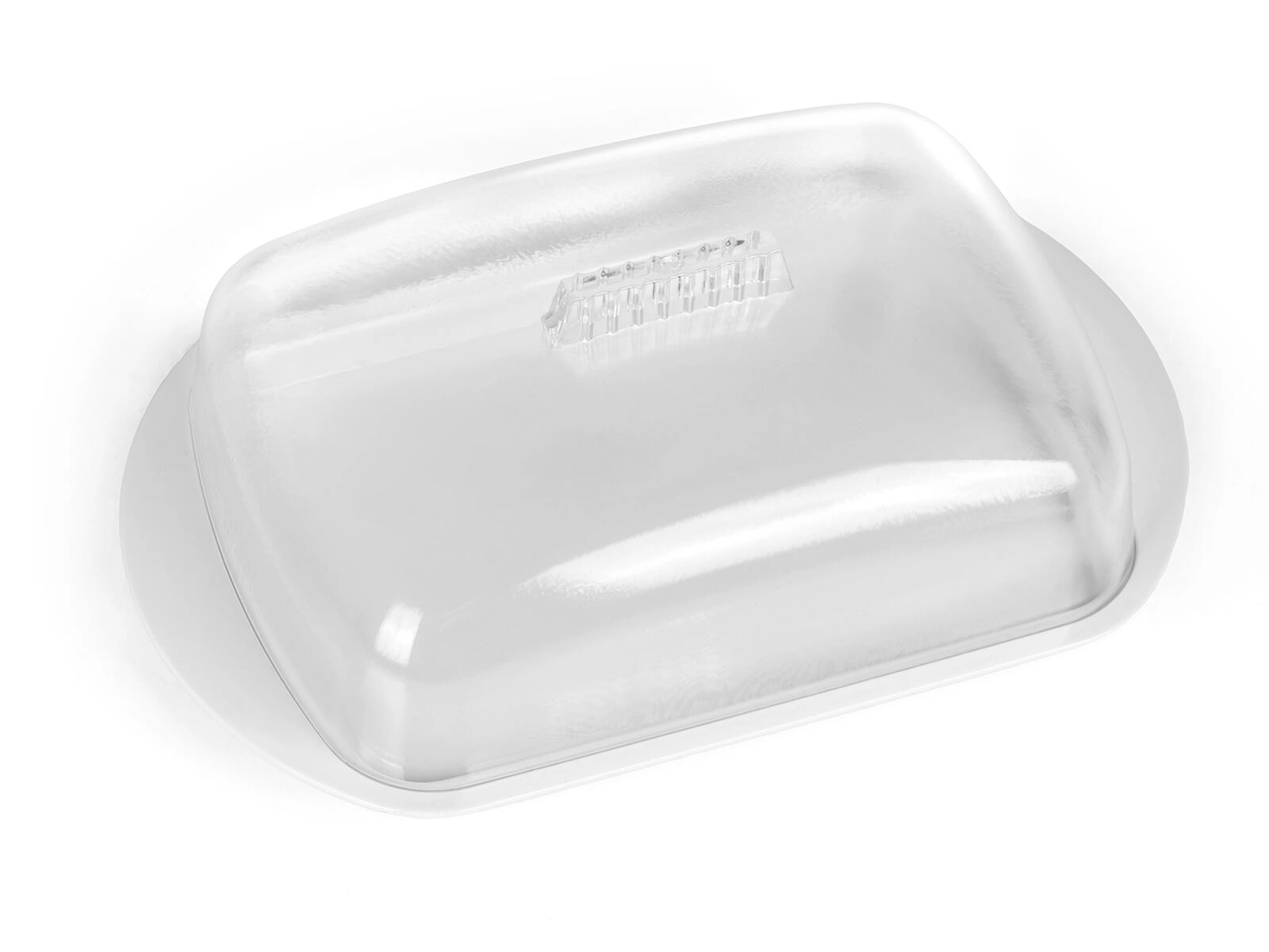 Le couvercle clair en forme de dôme, doté d’une prise rainurée, protège le beurre des odeurs et des impuretés tout en permettant un contrôle visuel immédiat de l’état et de la quantité.