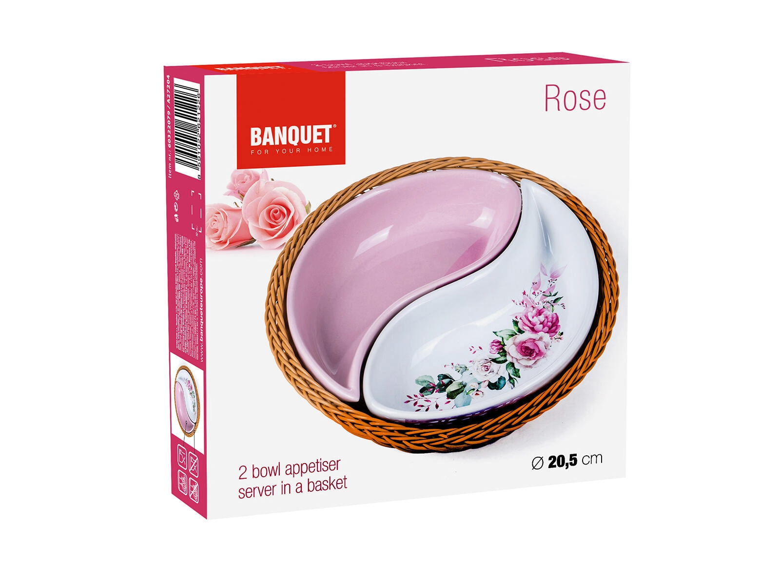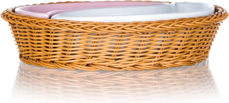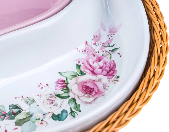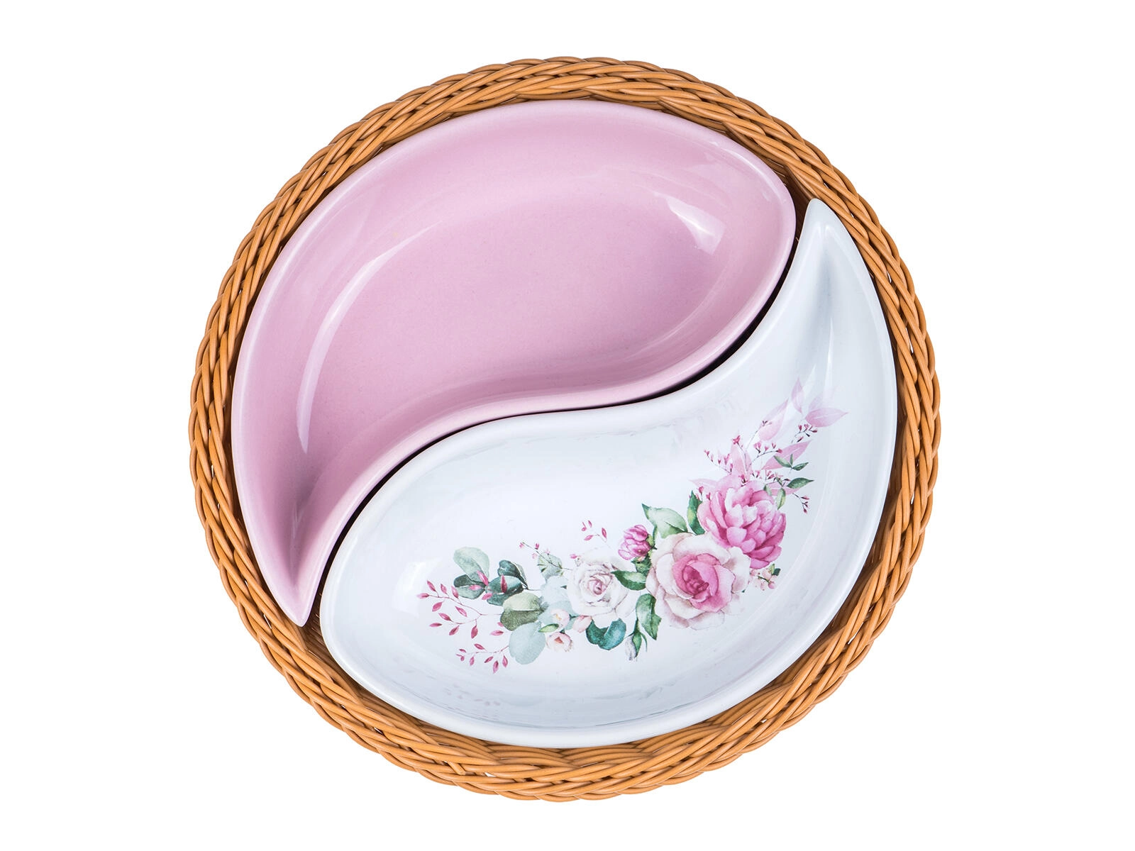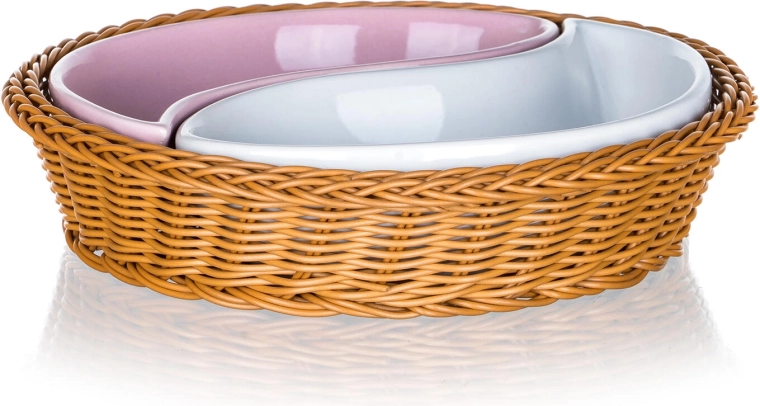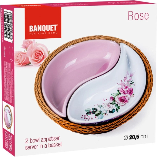 Élégant ensemble de bols ROSE en deux parties dans un panier rond en osier de 20,5 cm de diamètre, combinant une céramique brillante à glaçure rose et blanche avec un motif floral romantique. Idéal pour servir des snacks, des noix, des dips ou des accompagnements, avec une forme divisée pratique et un entretien facile.