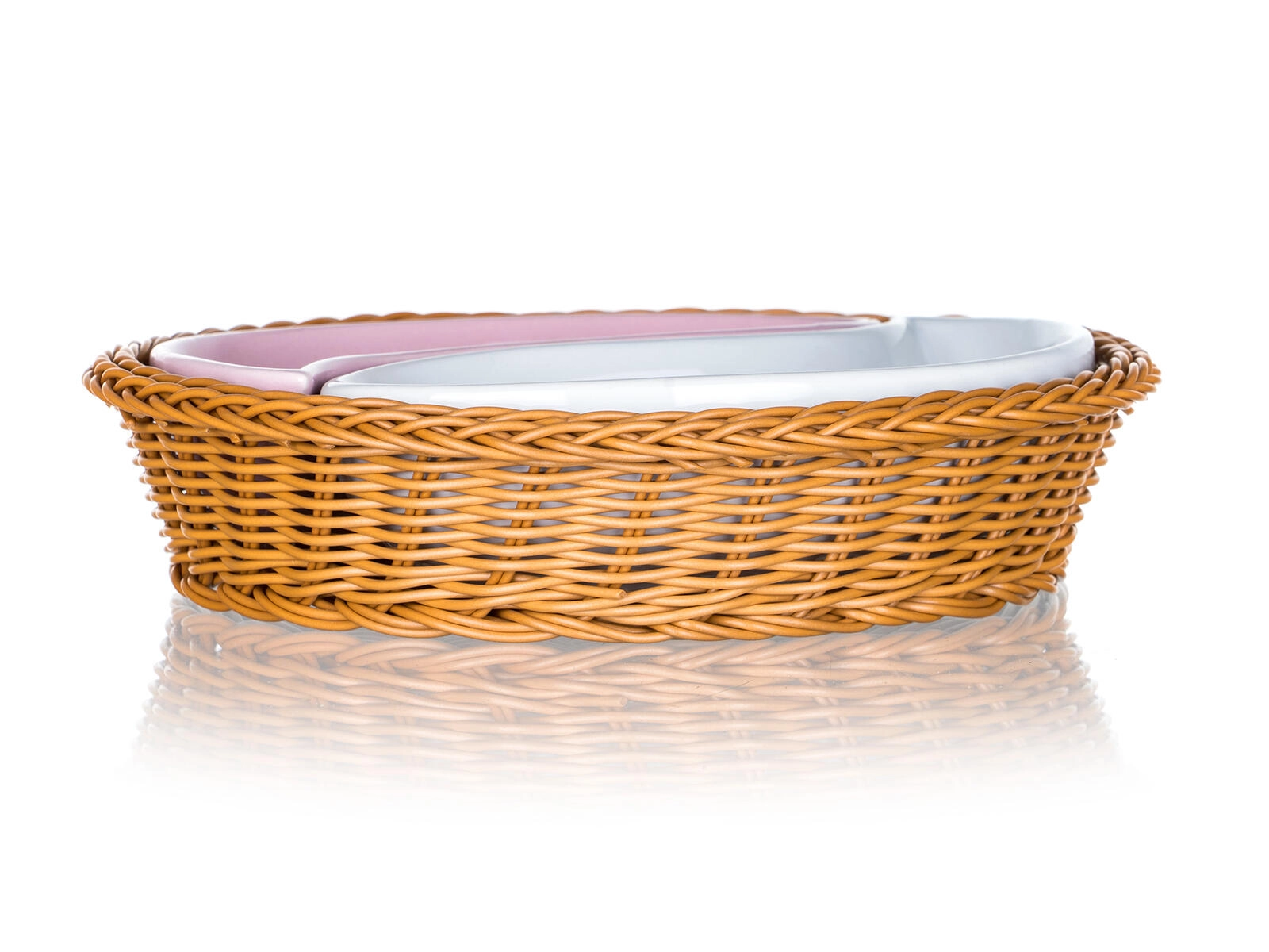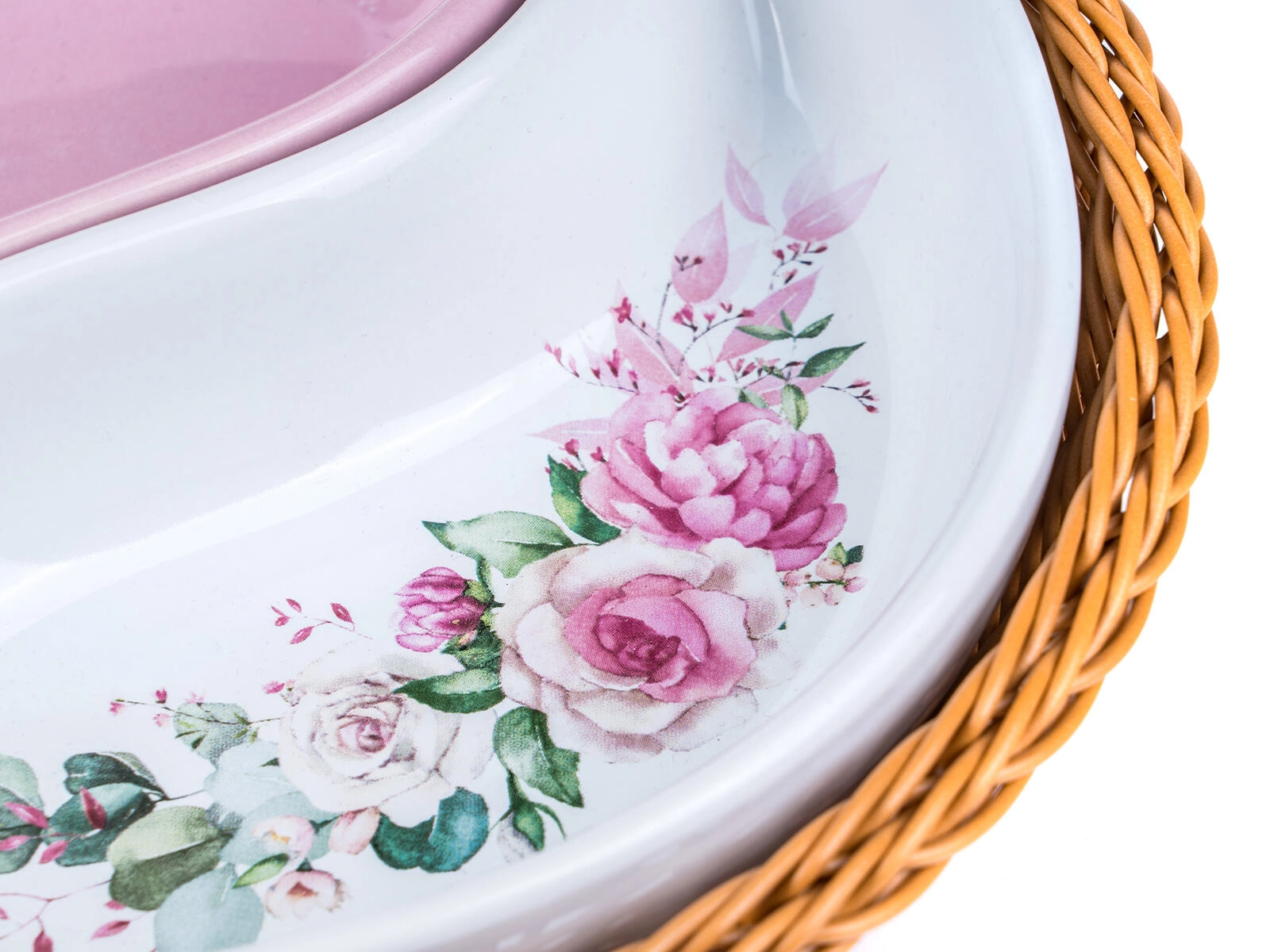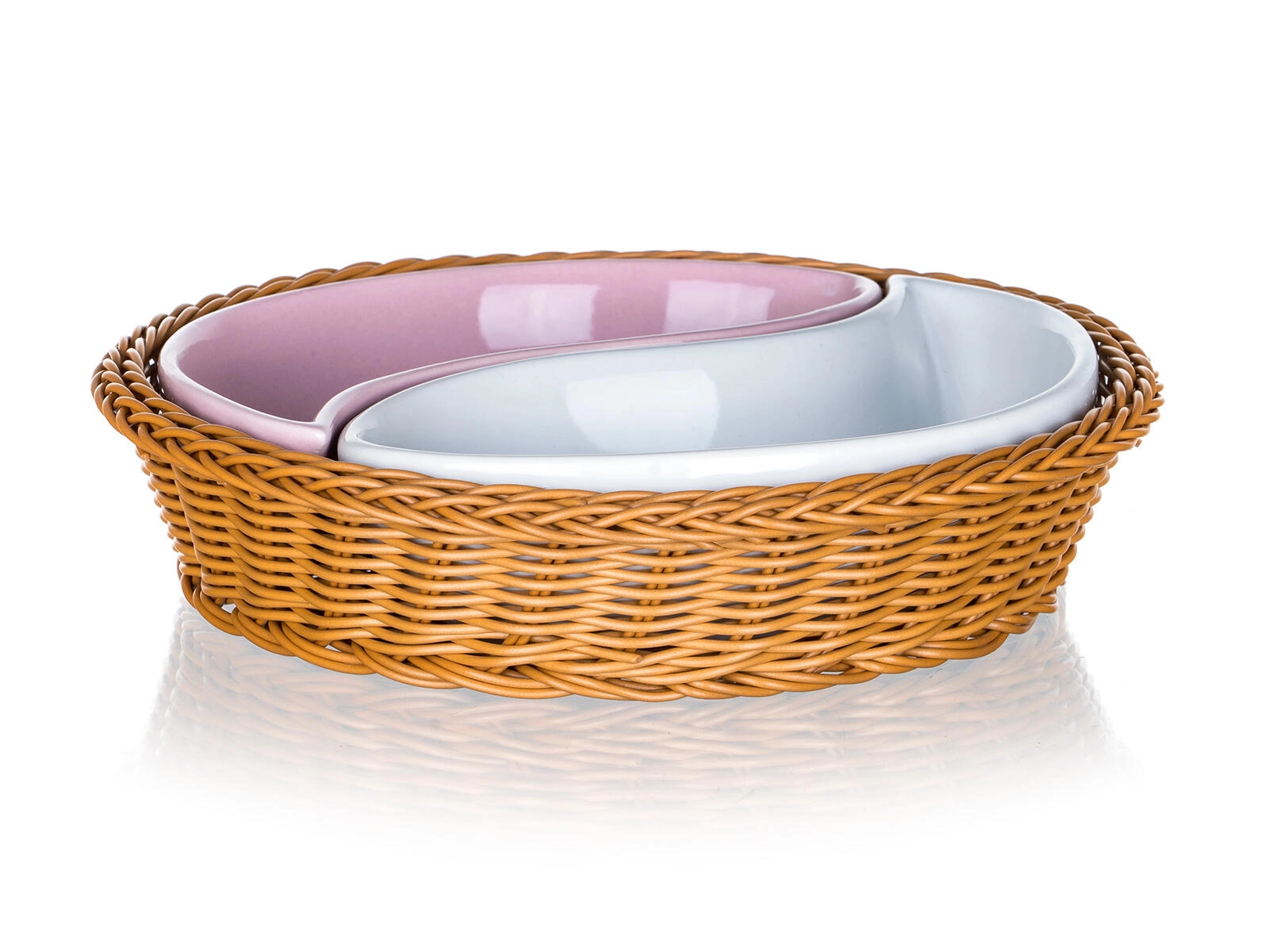 Élégant ensemble de bols ROSE en deux parties dans un panier rond en osier de 20,5 cm de diamètre, combinant une céramique brillante à glaçure rose et blanche avec un motif floral romantique. Idéal pour servir des snacks, des noix, des dips ou des accompagnements, avec une forme divisée pratique et un entretien facile.