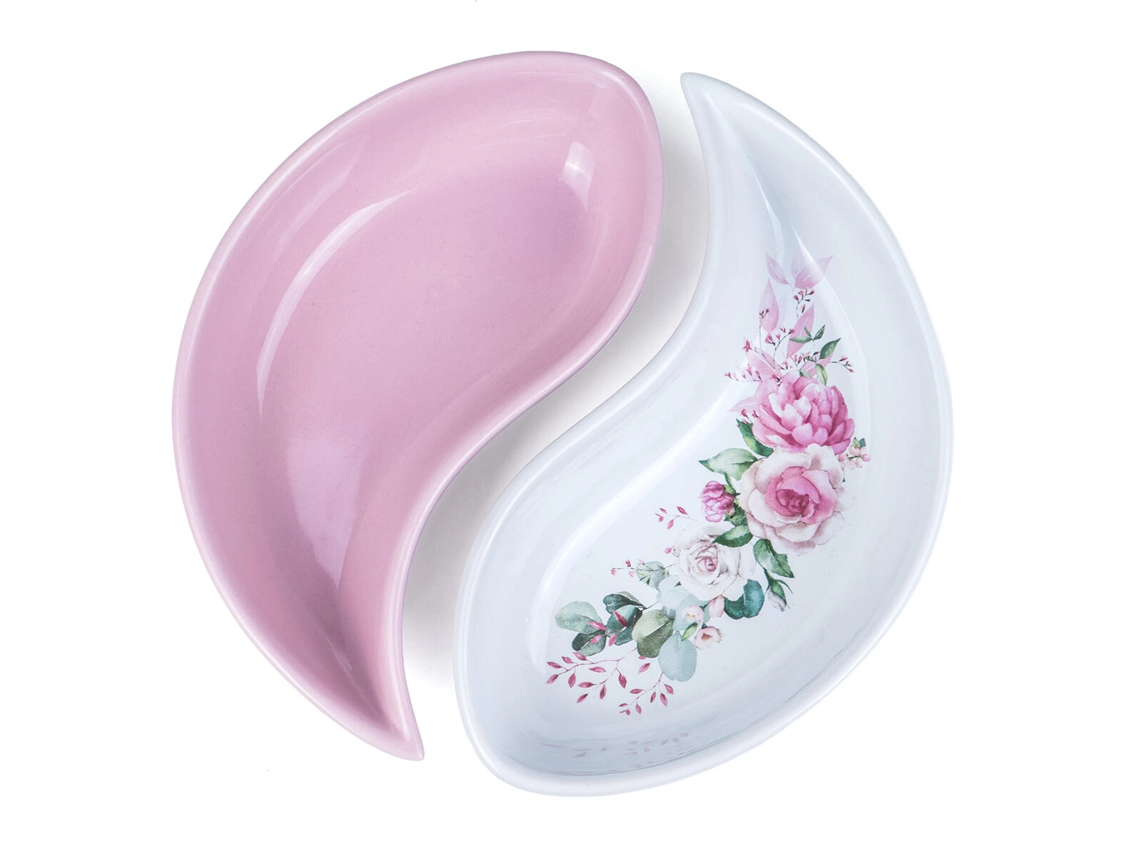 La forme yin‑yang permet de séparer élégamment deux types de gourmandises, de dips ou d’accompagnements dans un ensemble de service compact.
