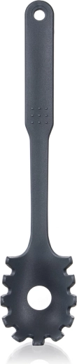Pratique cuillère à spaghetti en nylon PA66 résistant, dans une élégante couleur grise, pour un service facile des pâtes. Grâce au bord dentelé et à l'orifice d'écoulement central, vous pouvez prendre et égoutter les spaghetti en toute sécurité sans abîmer la vaisselle. Compatible lave-vaisselle, avec œillet de suspension et résistance à la chaleur jusqu'à 210 °C.