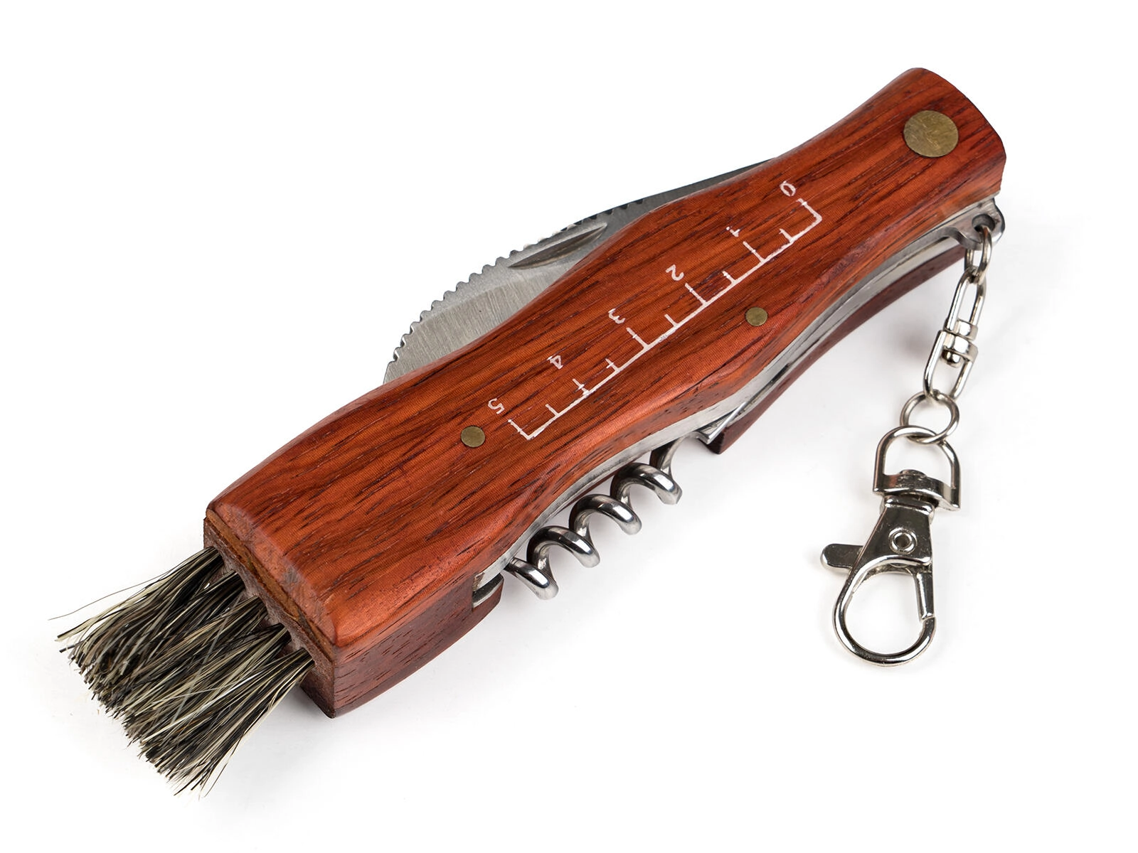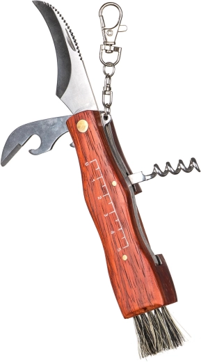 - Équipement multifonction : lame 7 cm, pinceau, tire-bouchon, mousqueton.