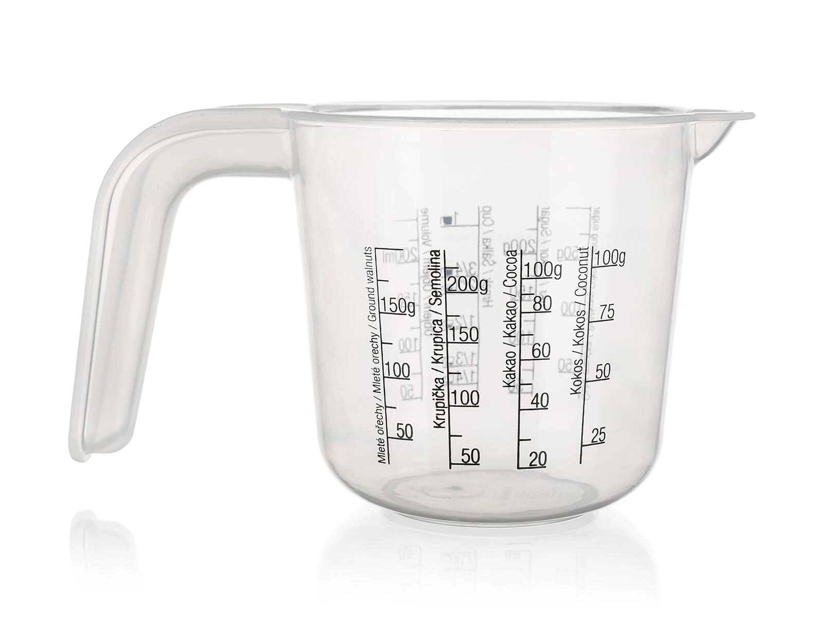 - Graduations spéciales pour la noix de coco râpée, les noix moulues, la semoule fine, le cacao, le sucre glace et le sucre cristal.