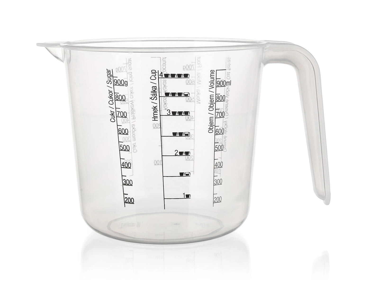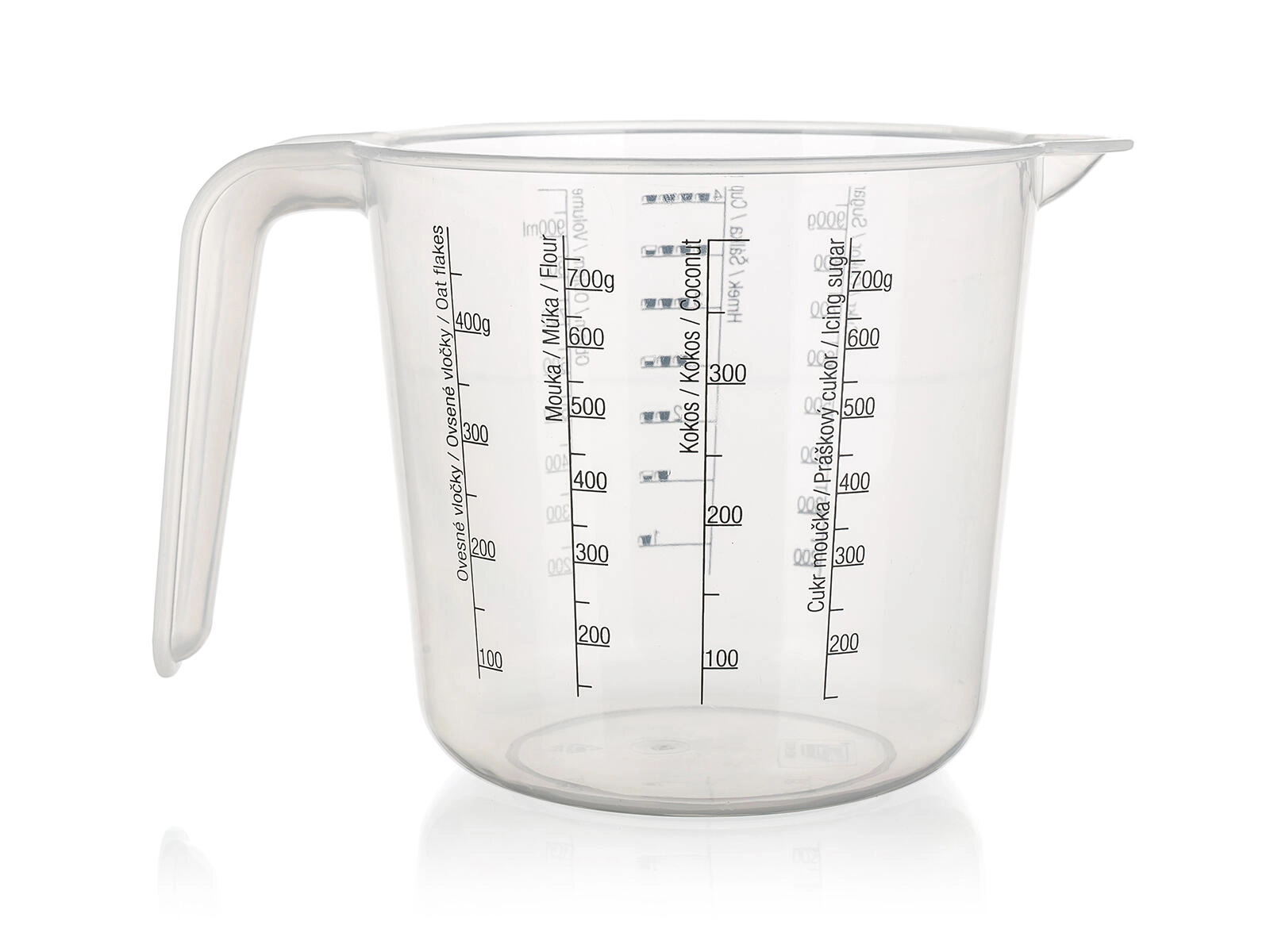 Pratique verre doseur en plastique d’une capacité de 1 L qui facilite une cuisson et une pâtisserie précises grâce à des échelles claires pour les ingrédients secs et liquides. Il propose des graduations pour noix de coco râpée, flocons d’avoine, farine, sucre glace, sucre ainsi que des volumes en ml et en tasses, pour tout avoir à portée de main dans un seul récipient.