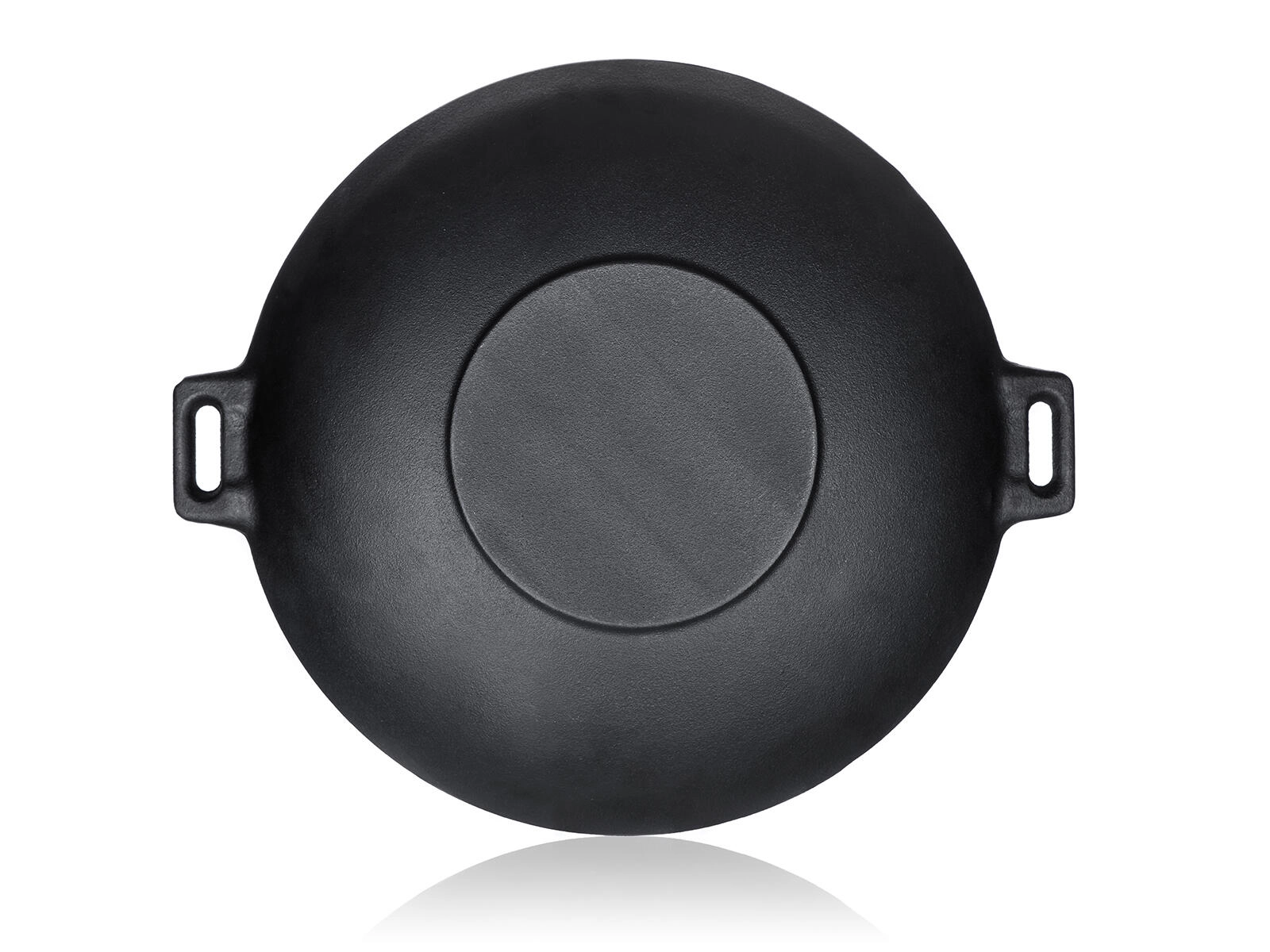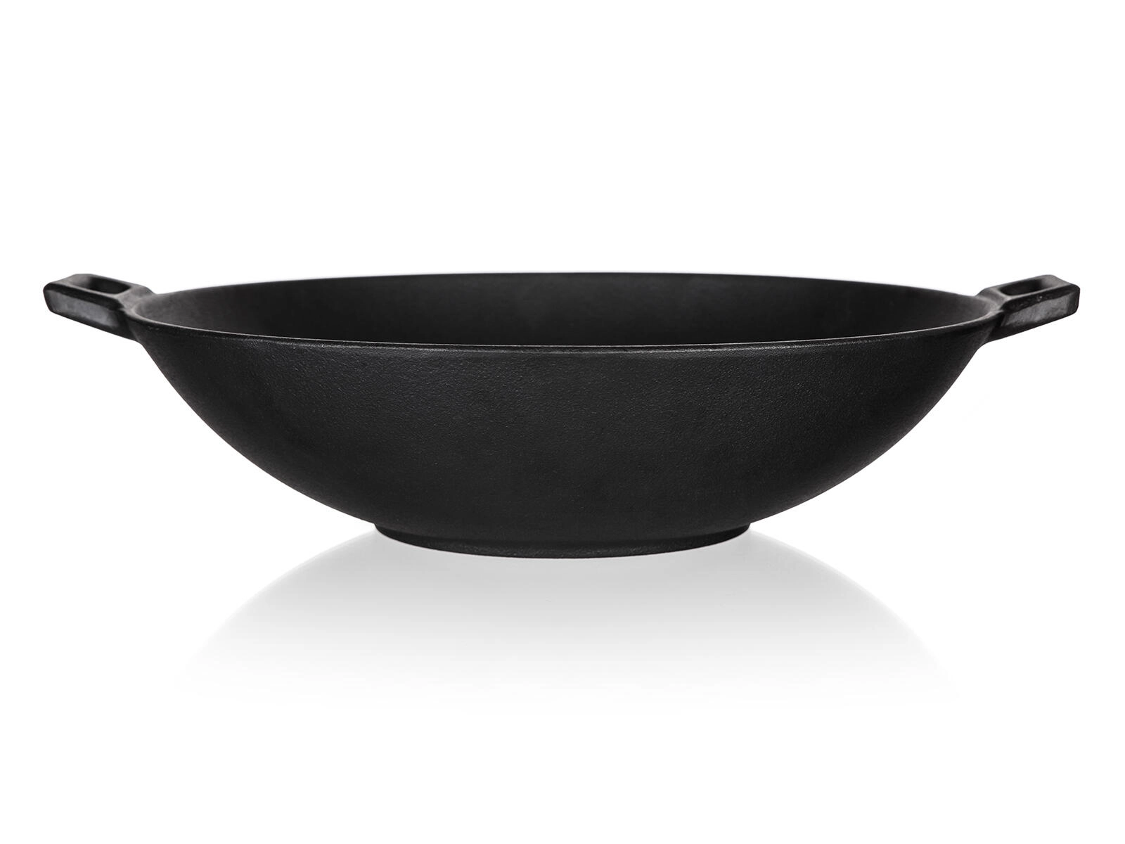 Wok en fonte robuste de 36,5 cm de diamètre pour la cuisine quotidienne sur tous types de plaques et au four. Grâce à la fonte massive, il offre une répartition homogène de la chaleur, une forte accumulation thermique et permet le sauté vif, la friture, le mijotage et la cuisson au four. Après un bon culottage à l’huile, il acquiert une surface naturellement antiadhésive.