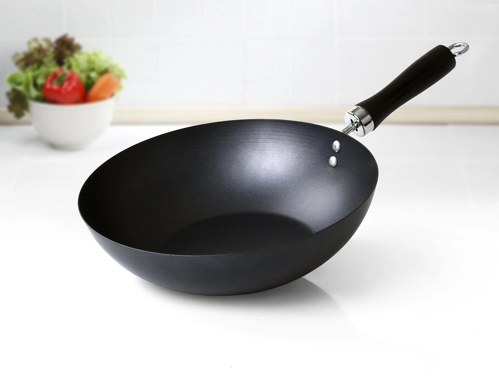 Wok universel de 28 cm de diamètre pour une préparation rapide de plats asiatiques et maison. Grâce à l’acier au carbone avec un revêtement antiadhésif, les aliments n’attachent pas et les parois fines transmettent rapidement la chaleur. La poignée métallique avec manche en bakélite tient bien en main et l’anneau permet une suspension pratique.