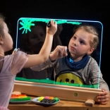 La plaque robuste en verre trempé résiste à l’enthousiasme des enfants et permet de peindre à l’aquarelle, au doigt et avec des feutres lavables. On peut dessiner des deux côtés, pour que les enfants se relaient ou créent ensemble.