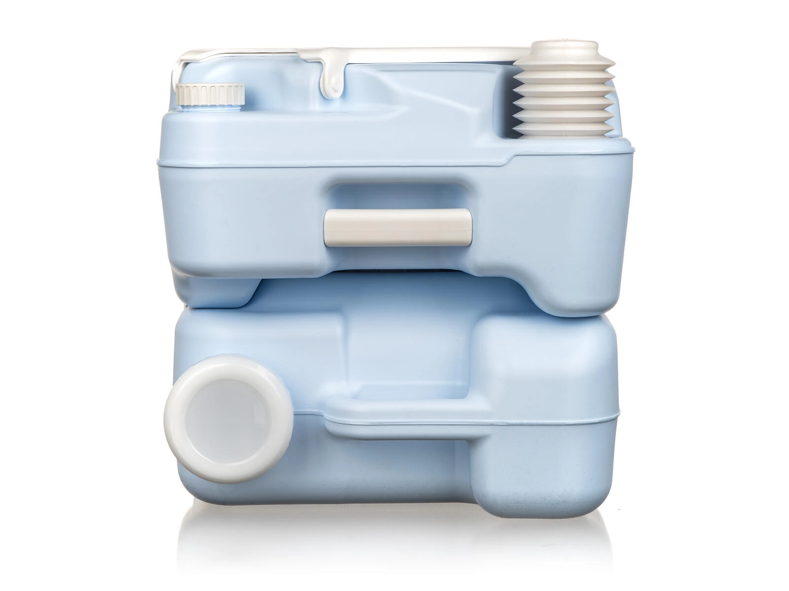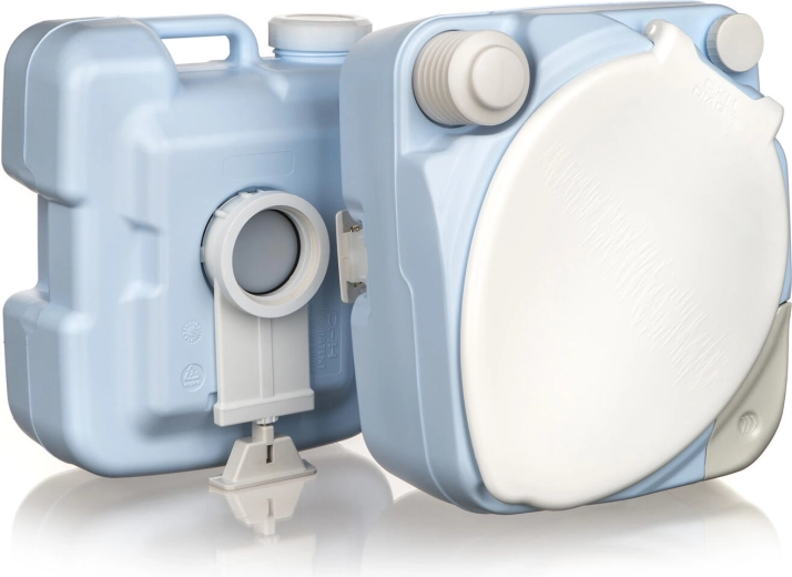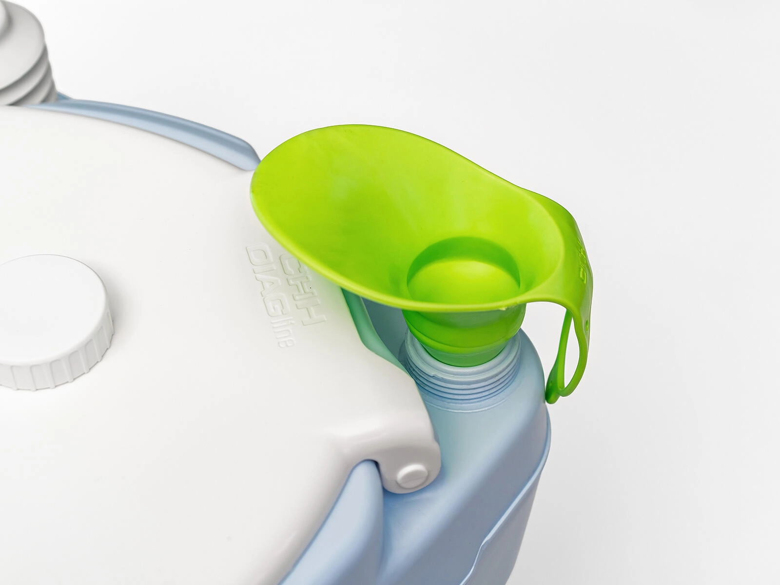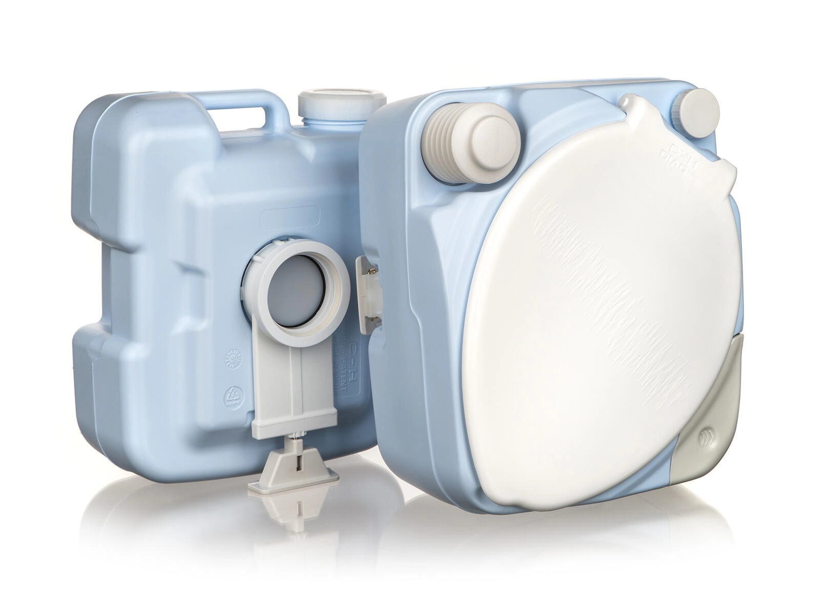 La toilette dispose d’un réservoir d’eaux usées de 15 l et d’un réservoir d’eau propre de 11 l, offrant une capacité suffisante pour des séjours de plusieurs jours. Les nouvelles lignes arrondies, l’abattant et le couvercle blancs renforcent la sensation de propreté, tandis que le fond de réservoir renforcé augmente la charge admissible et la résistance lors de transports fréquents. La forme diagonale permet une installation peu encombrante dans un angle même dans les petits espaces.