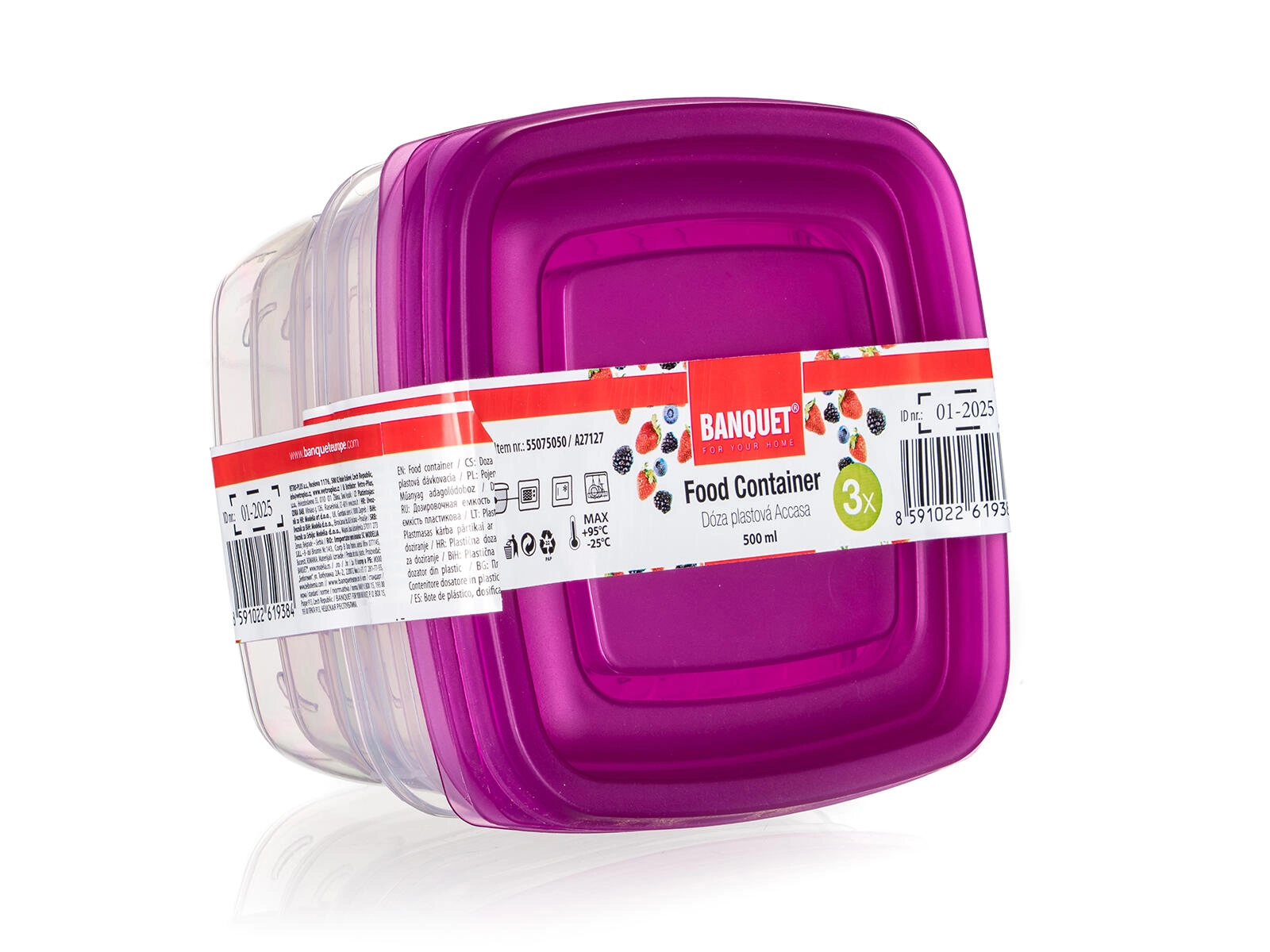Pratique, cet ensemble de trois boîtes carrées ACCASA de 0,5 l est idéal pour conserver au quotidien plats, collations et ingrédients. Les corps transparents offrent un aperçu rapide du contenu et les couvercles violets à clipser aident à maintenir la fraîcheur et à limiter les fuites. Grâce au design empilable, vous gagnez de la place au réfrigérateur comme au garde-manger, et le plastique résistant assure un entretien facile et une réutilisation durable.