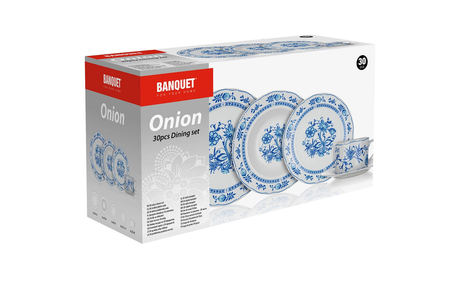 Élégant service de table en porcelaine de 30 pièces avec le décor traditionnel à motif d’oignon ONION, qui transforme chaque repas en une expérience unique. La porcelaine de qualité est compatible lave-vaisselle et micro-ondes, alliant ainsi beauté et praticité au quotidien.