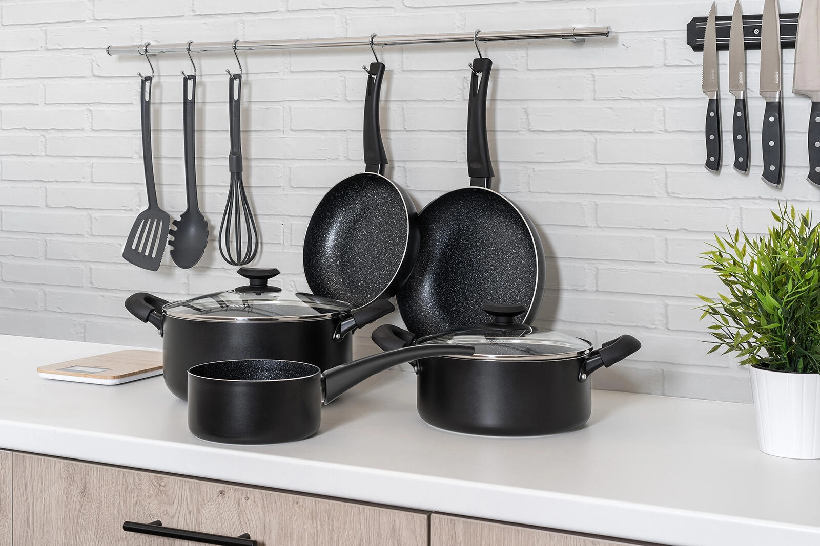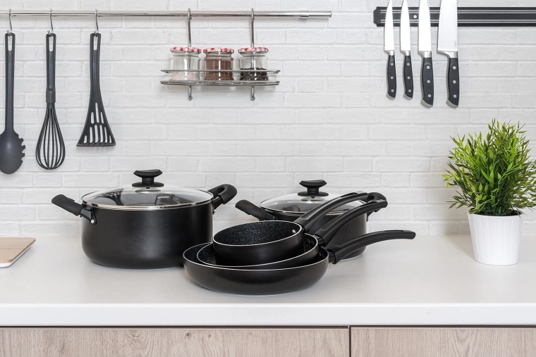 La batterie de cuisine BLACK STONE, au design élégant noir, couvre les besoins quotidiens, de la saisie rapide au mijotage lent. L’aluminium coulé à haute conductivité thermique chauffe rapidement et conserve longtemps la chaleur, pour une cuisson plus rapide et plus économe. Le revêtement antiadhésif hautement résistant assure un démoulage facile des aliments et un nettoyage simplifié.